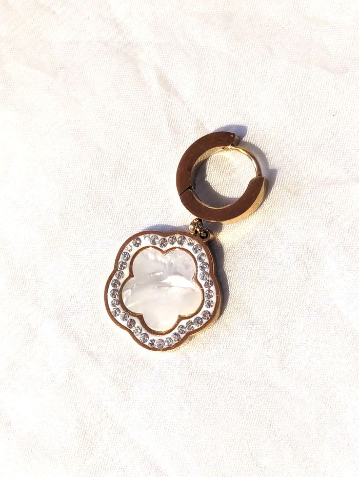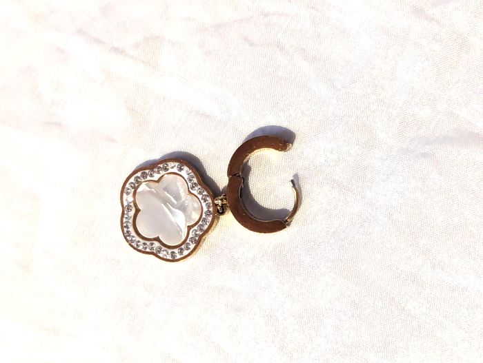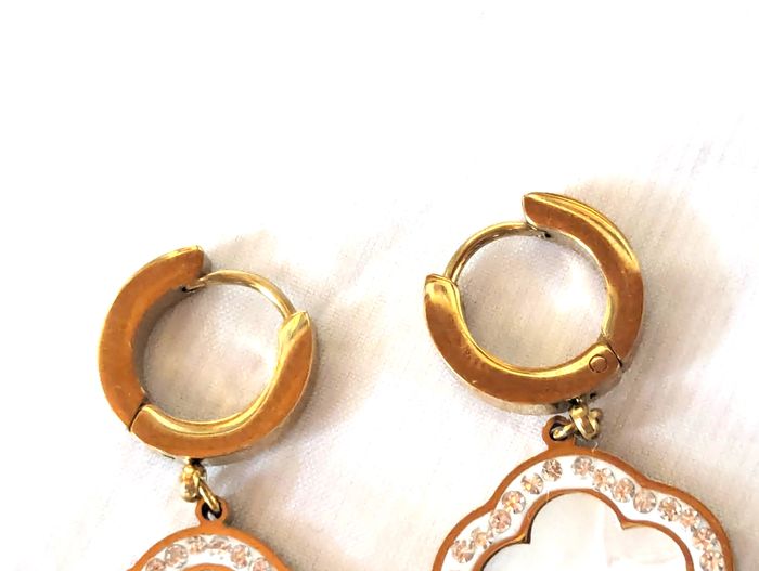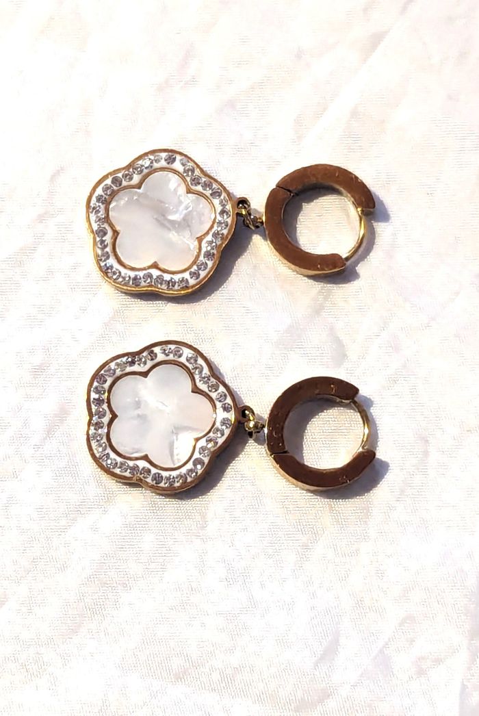 Boucles Oreilles Pendantes Fleur Blanche Nacrée Pétales Arrondis Strass Bijoux Dorés Fantaisie Femme - photo numéro 1