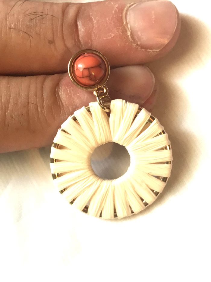 Boucles Oreilles Pendantes Pierre Ronde Rouge Cercle Tissé Fil Blanc Bijoux Dorés Fantaisies Femmes