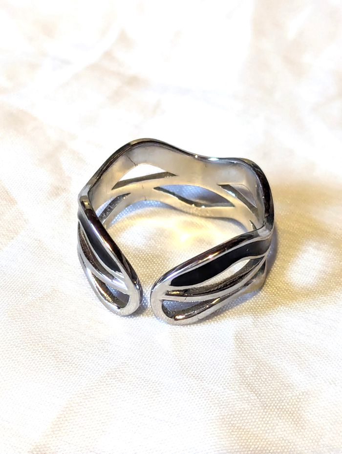 Bague Anneau Ouverte Large Ondulée Bande Noire Bijou Argenté Fantaisie Femmes - photo numéro 1