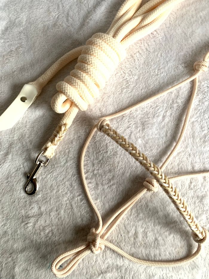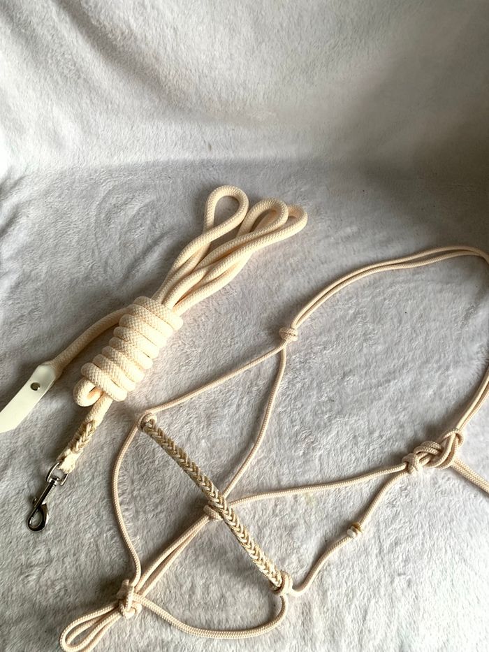 Licol en corde Taille cheval Crème Avec sa tresse or crème blanc Sa longe de 3m Et un popper en biothane
