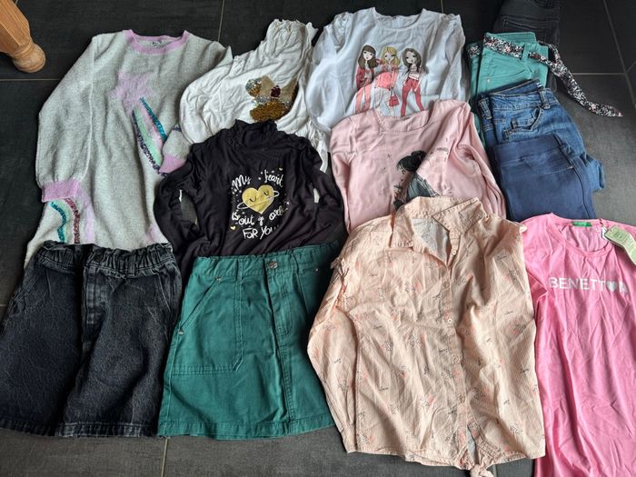 Bonjour, vend lot fille 10 ans très bon état Comprend: -1 robe pull gemo -2 maillot manche longue col roulé orchestra -2 maillot manche longue ma boutique plus -1 chemise orchestra -1 jupe en jeans kiabi -1 jupe ma boutique plus -1 tee shirt rose benetton neuf -1 jeans vert d’eau Lili castagnette -1 jeans bleu kiabi