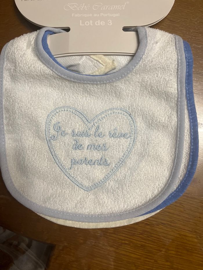 Lot de 3 bavoirs brodés je suis le rêve de mes parents 80% de coton 20% de polyester Fabriqué au Portugal 3 couleurs ds le lot . Acheté 6,90