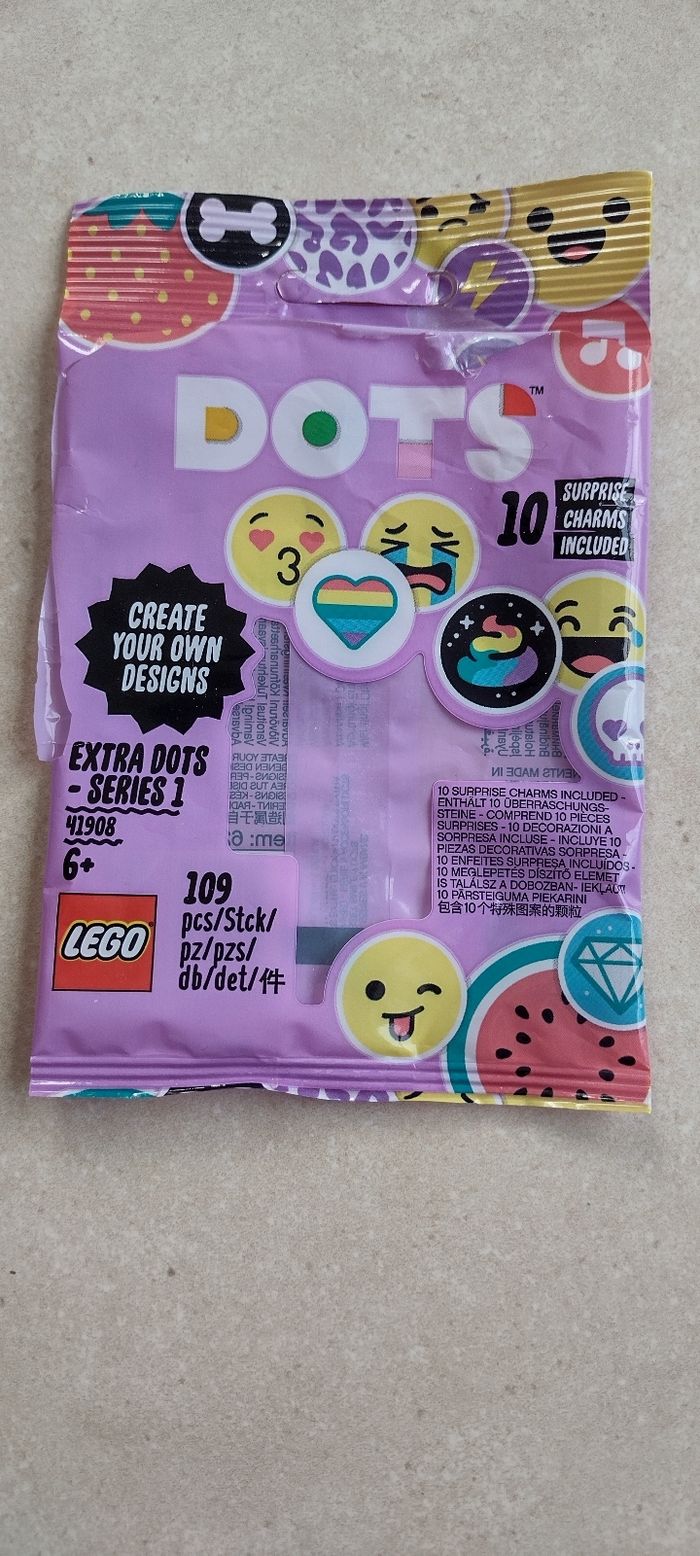 Lego Dots 41908 : Tuiles de décoration DOTS - Série 1. Compatibles avec tous les LEGO. Comprend 109 pièces colorées, dont 20 tuiles à paillettes et 10 pièces "Charms" imprimées spéciales. Le sachet a été ouvert mais toutes les pièces sont présentes et en TBE. Compatible avec le bracelet Lego Dots (voir mes autres annonces).