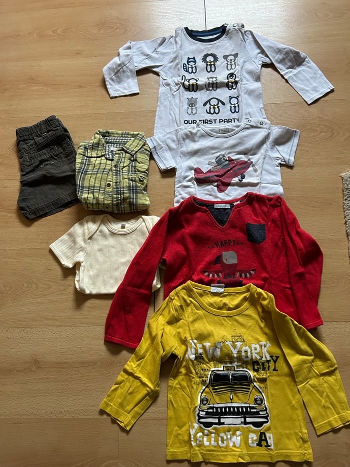 Lot vêtements garçons: 1 body 1 pull 1 short 2 t shirts manches longues 1 t shirt manches courtes 1 chemise