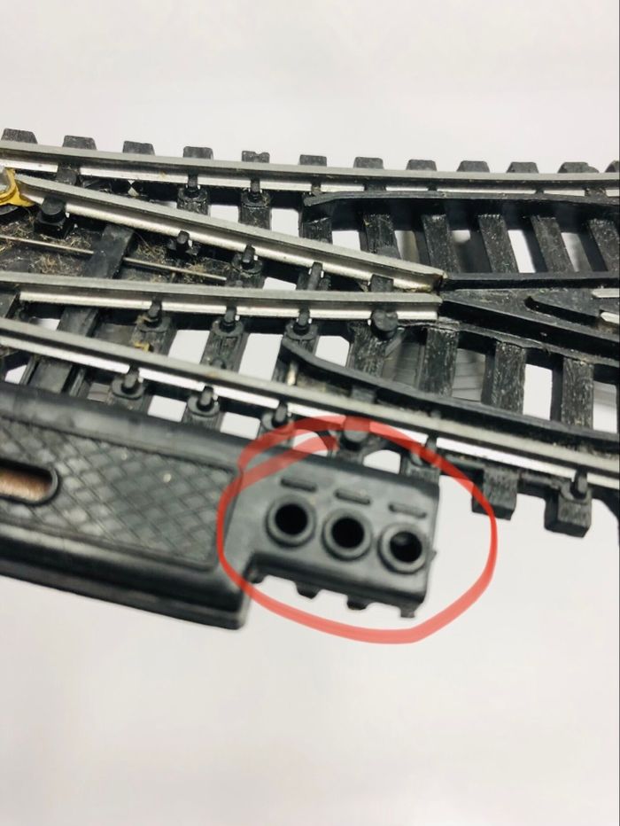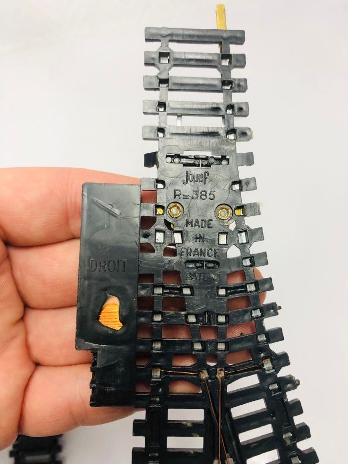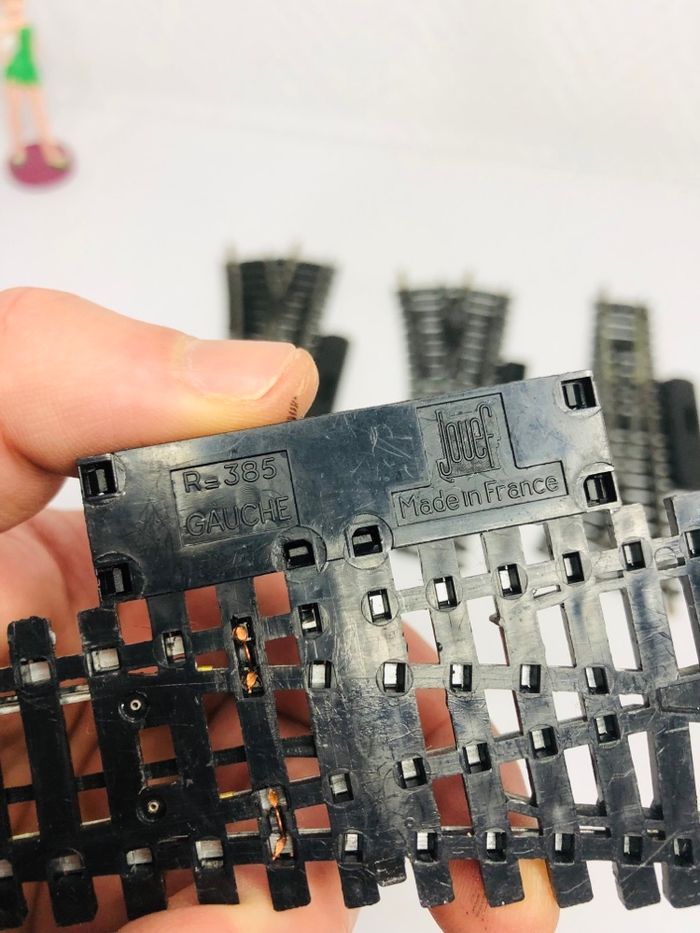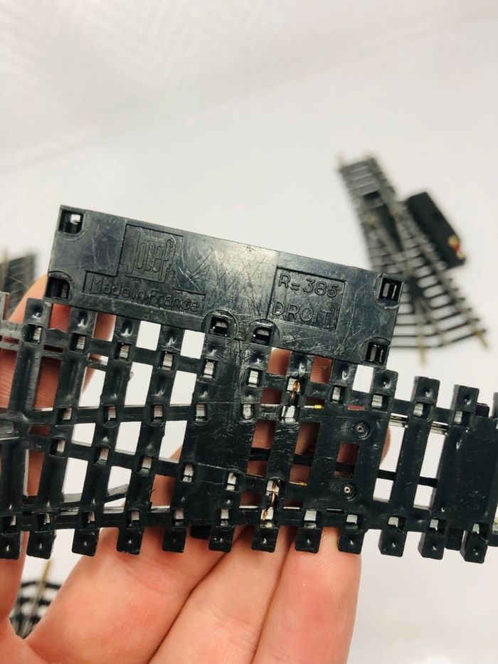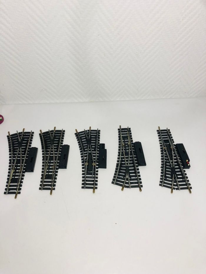 Lot de 5 aiguillages droits et gauches Jouef réf. 385. - Type de produit : Aiguillages de voie ferrée - Marque : Jouef - Modèle : Réf. 385 En très bon état., celui en photo entouré en rouge n’a plus les bornes de connexion voir dernière photos.