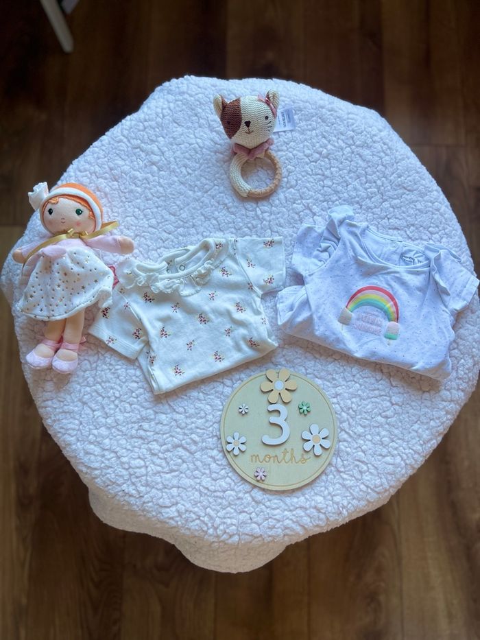✨ bodies manches courtes. Bodies avec l’arc en ciel peut être porté avec un pantalon et rien au dessus. Taille 3 mois. 🌸 Envoie rapide et soigner.