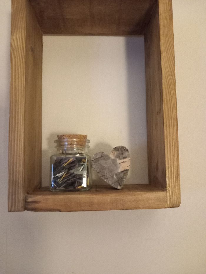 « 🩵L’écrin des petits cœurs suspendus » ✨ Descriptif Cette décoration murale faite main est un véritable écrin de douceur et d’authenticité. Réalisée en bois brut, elle prend la forme d’une petite niche aux lignes simples et chaleureuses. En son centre, un délicat flacon en verre suspendu par une corde naturelle renferme de fines tiges décoratives, apportant une touche poétique et aérienne à l’ensemble. À la base, deux cœurs en bois aux finitions patinées reposent harmonieusement, symboles de tendresse et de simplicité. Chaque élément semble avoir été choisi avec soin pour créer une atmosphère douce, naturelle et légèrement bohème. Idéale pour habiller un mur, une entrée ou un coin cosy, cette création artisanale s’intègre parfaitement dans une décoration de style rustique, scandinave ou campagne chic. Chaque pièce étant faite main, elle est unique et pleine de charme. 📐 Dimensions 19 x 24 x 7,5 cm
