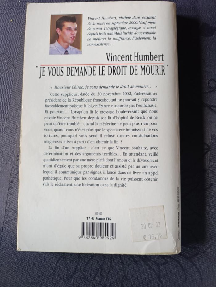 📖 "Je vous demande le droit de mourir" – Vincent Humbert Un témoignage bouleversant et poignant, à lire au moins une fois dans sa vie. 📚 Livre en bon état 🏡 Maison non fumeurs 💶 Prix mini : 1€ seulement ! 📦 Envoi rapide et soigné 💝 Réduction si achat en lot – jetez un œil à mes autres annonces ! Faites une belle découverte à petit prix ✨ #regent57livres #p6 #26