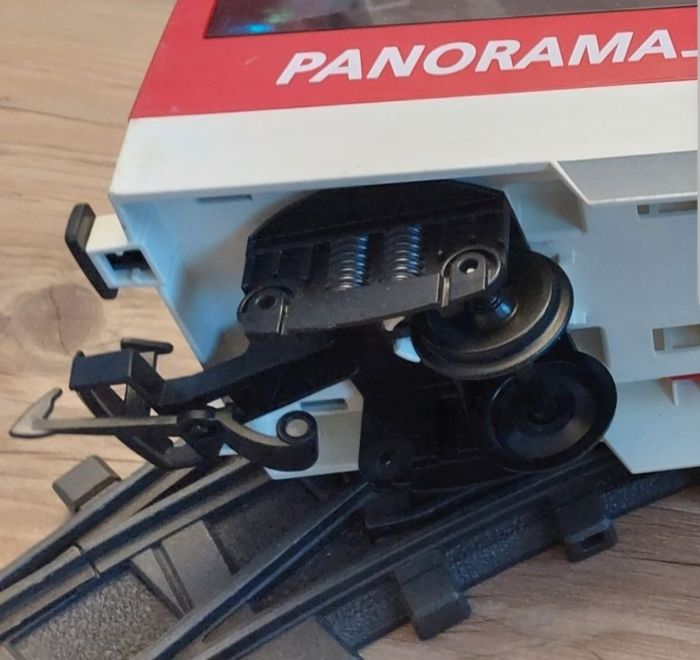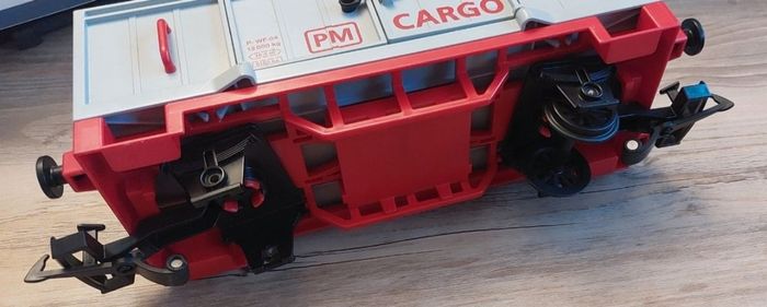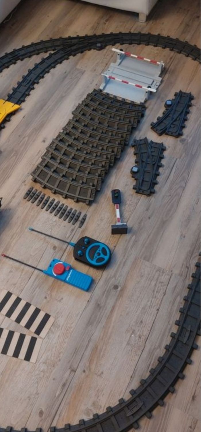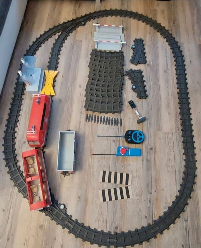 Train radio commandé Playmobil 4010 + extension rail, passage à niveau, il manque 1 essieu sur le wagon marchandise et 1 sur le wagon passager. Deuxième télécommande. La locomotive fonctionne parfaitement.