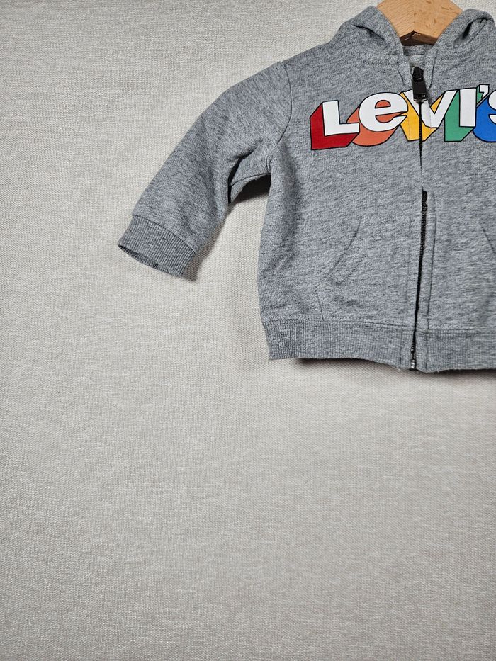 Hello ! 👋 Je te propose cette pièce de la marque Levi's, une super trouvaille pour ton dressing ! pour le dressing de bébé 👶 Ce sweat à capuche zippé gris chiné affiche le logo iconique en version multicolore pour un style sportswear tendance. Informations utiles: * 👕 Article : Gilet zippé à capuche / Sweat * 📏 Taille : 3 mois (62 cm) * 🌈 Couleur : Gris chiné et logo coloré * 🧵 Matière : 80% coton, 20% polyester * ✨ État : ⭐⭐⭐⭐ Les petits + : 🏡 Logement non fumeur et sans animaux. 📦 Envoi rapide et soigné. N'hésite pas si tu as la moindre question ou si tu veux d'autres photos ! Je suis là. 😉 #levis #3mois #62cm #sweatzippe #giletcapuche #bebe #gris #sportswear #coton #marque