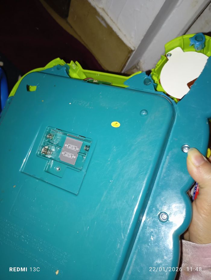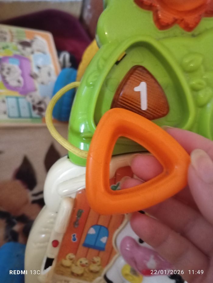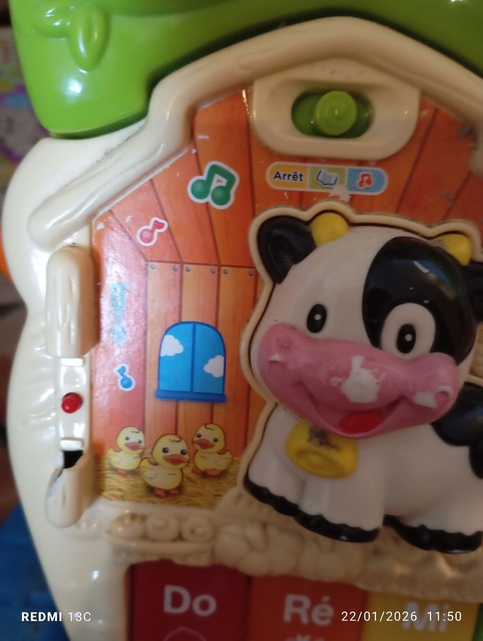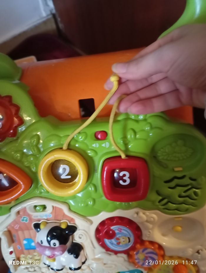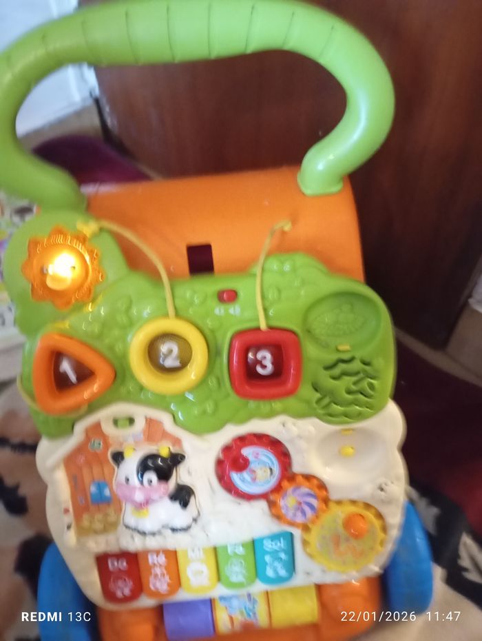 Trotteur bébé pour apprendre marche Manque le téléphone La porte des oiseaux est cassée Les cordons du carré et du cercle sont débranchés Il est cassée à l’arrière et ne tient pas complètement à cause d’une utilisation fréquente, mais les lumières et la musique fonctionnent très bien C’est pour cela que je l’ai mise à ce prix.