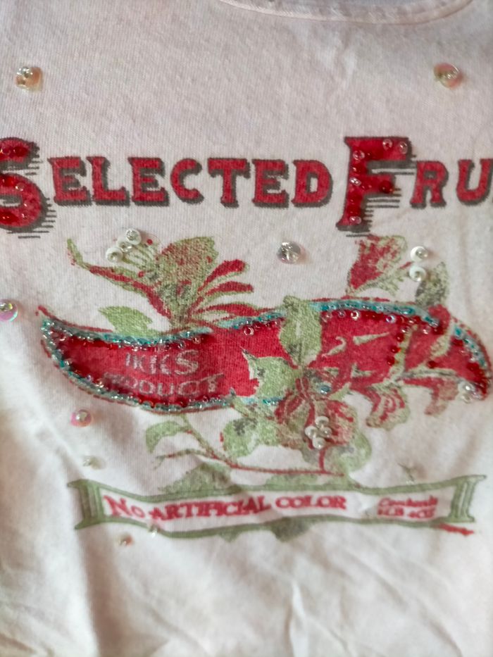 BE Porté mais pas de défaut. Joli tee-shirt à manches courtes en jersey de coton rose pâle. Motif avec perles de rocaille devant, lien tressé sur les côtés et pressions à l'épaule