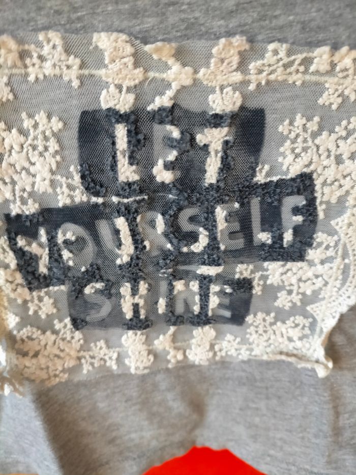 TBE Très joli tee-shirt à manches courtes en jersey de coton gris chiné. Dentelle avec inscription devant