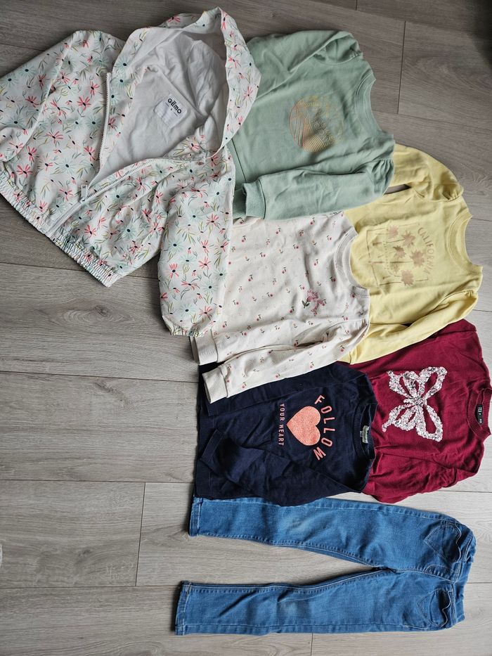 Lot vêtements printemps fille 5 ans composé 1 jean 1 veste fleurie coupe vent 3 sweat léger jaune, vert et blanc à fleurs 2 pulls légers (bordeaux et bleu marine