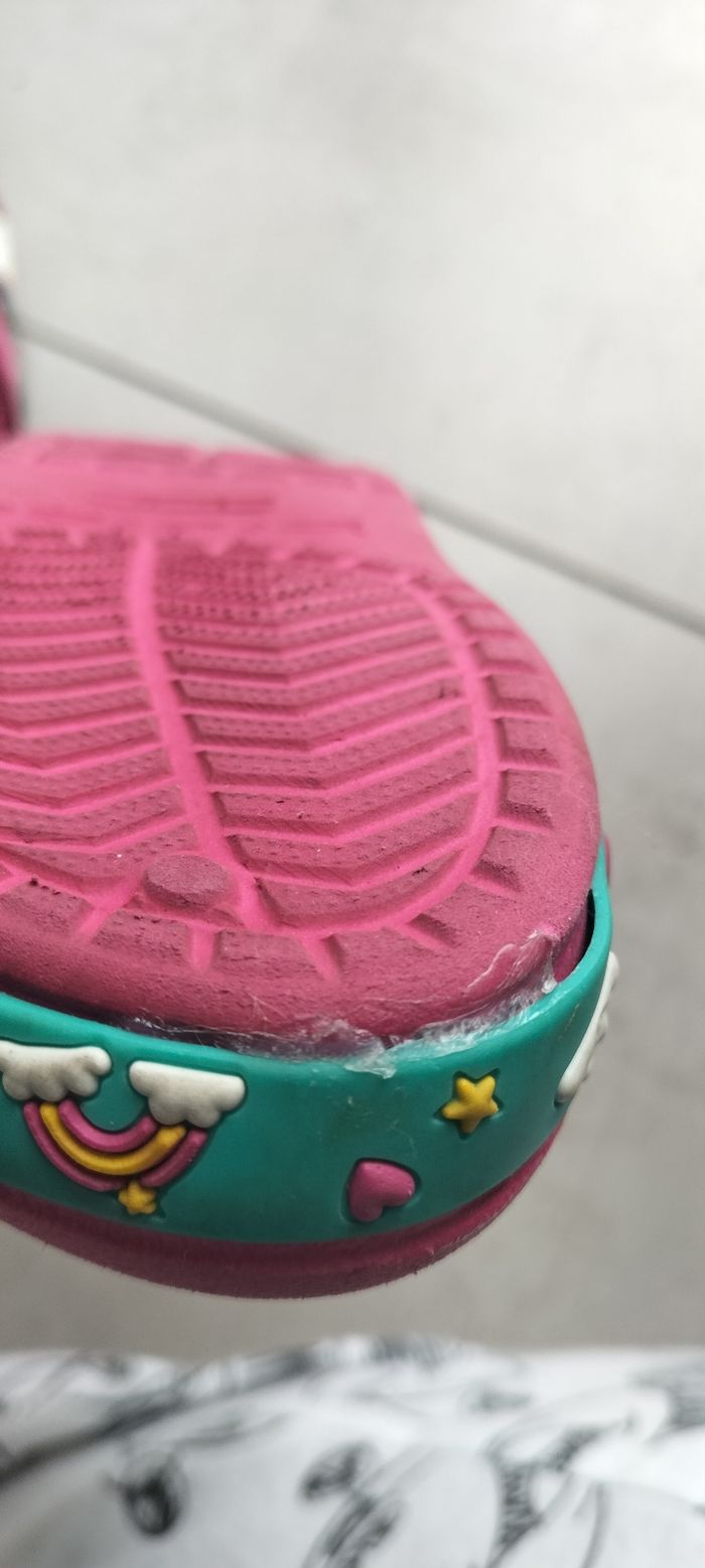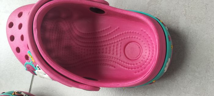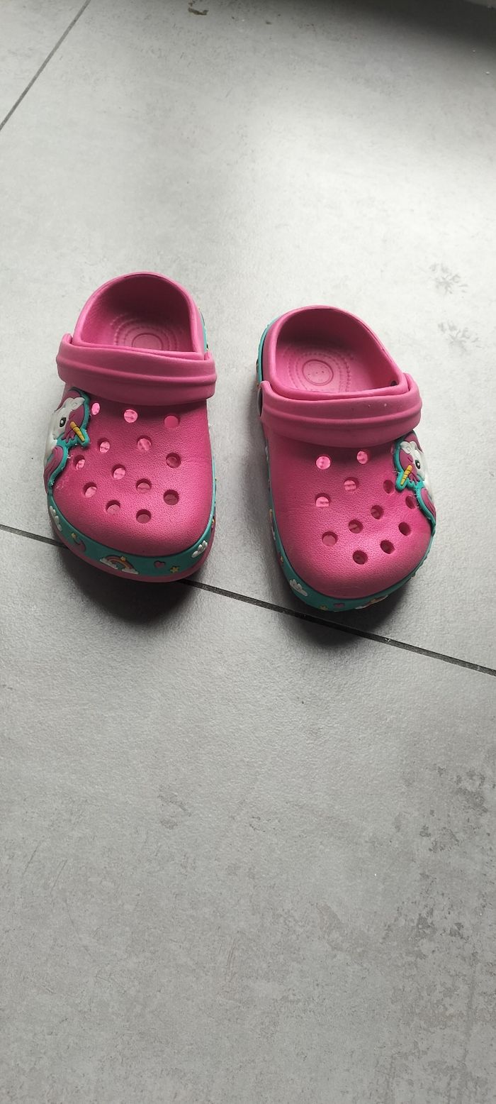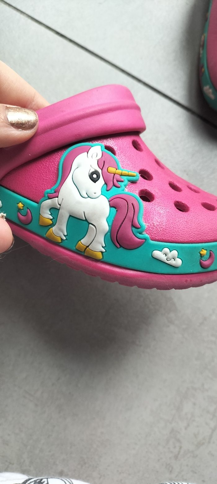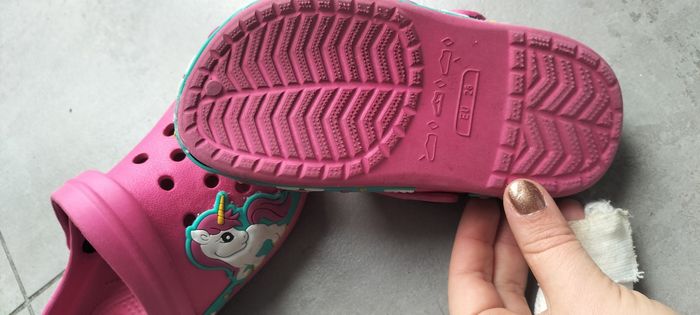 Sabot en plastique (type Crocs) Fushia motif licorne Taille 26 Présente de trace de colle (acheter comme ça)