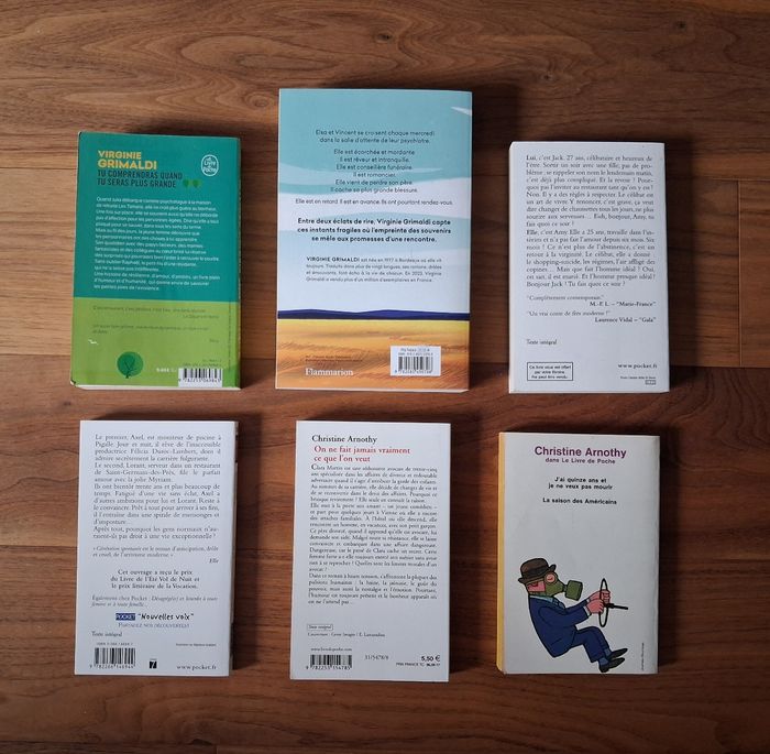 Virginie Grimaldi ✏️ Plus grand que le ciel Edition Flammarion Très bon état Prix éditeur : 20,90 € ✏️ Tu comprendras quand tu seras plus grande Edition Le livre de poche Très bon état Prix éditeur : 9.40 € ✏️ Génération spontanée Christophe Ono-Dit-Biot Edition Pocket Très bon état Prix éditeur : 7,20 € ✏️ Jamais deux sans toi Josie Lloyd & Emlyn Rees Edition Pocket Comme neuf ✏️ On ne fait jamais vraiment ce qu l’on veut Christine Arnothy Edition Le livre de poche Très bon état ✏️ Chiche (Offert pour l’achat du lot) Christine Arnothy Edition Le livre de poche Bon état - jauni Il s’agit de livres d’occasion, ils présentent donc des traces d’utilisation ou des marques sur les couvertures. N’hésitez pas à demander des photos supplémentaires en cas de besoin. Livraison acceptée Ou remise en main propre possible sur Paris (Bibliothèque François Mitterrand, Gare de Lyon), La Défense, Etampes, etc...