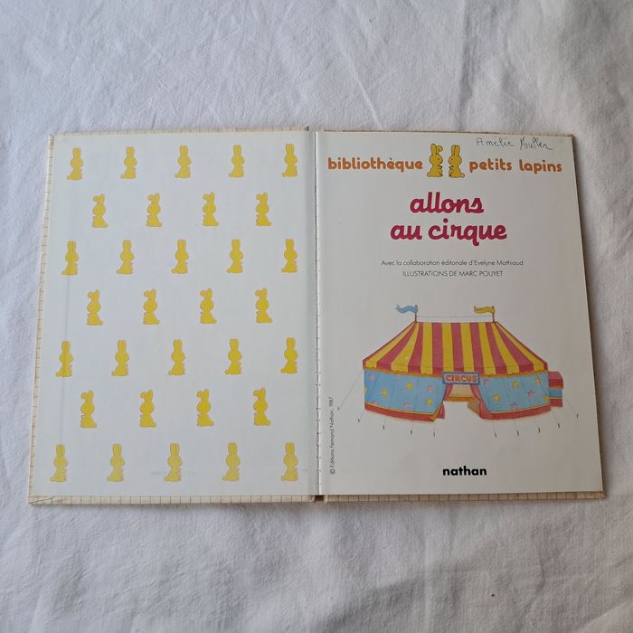 Livre Allons au cirque Bibliothèque Petits Lapins Nathan Fernand 1987 1989 Illustrations Marc Pouyet Dimensions : 15 x 20 cm Poids : 126 grammes Bon état, couverture décolorée, 1 tâche, nom inscrit voir les photos