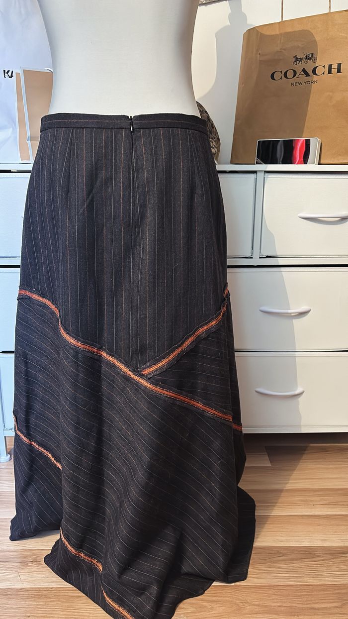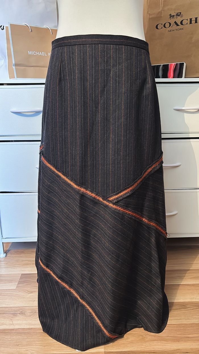15€ 🪩 Jupe longue 💙 Fines rayures 📏 Dimensions : longueur 85cm, largeur 40cm 📦 État : Très bon état Matière : 60% polyester, 21% laine, 17% viscose, 2% lycra Jupe longue élégante de couleur noir/gris foncé à fines rayures, avec un jeu de coutures asymétriques et des détails surpiqués orangés.