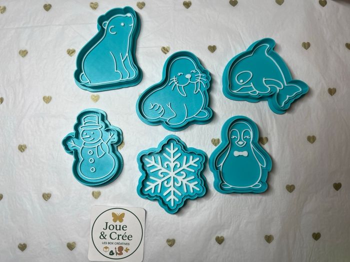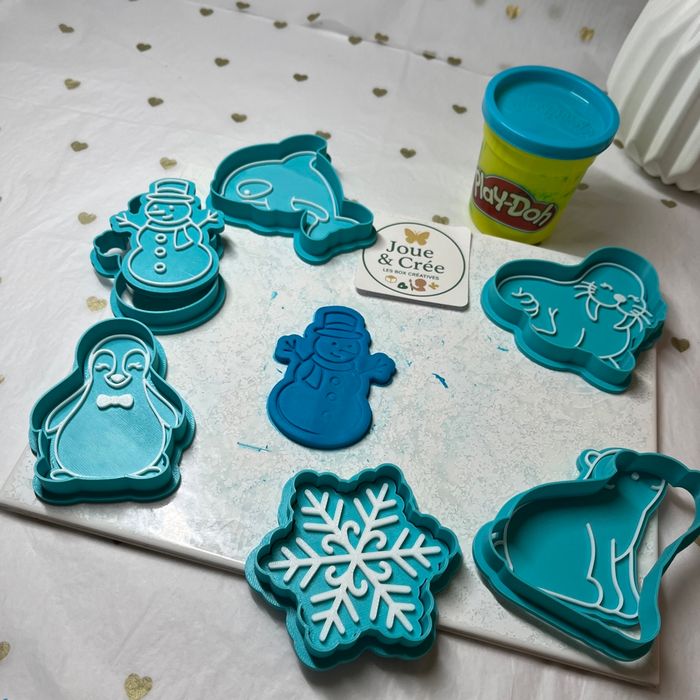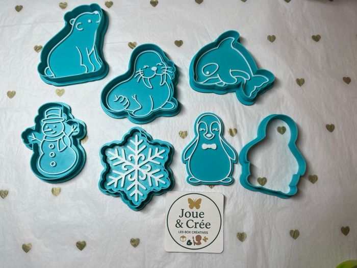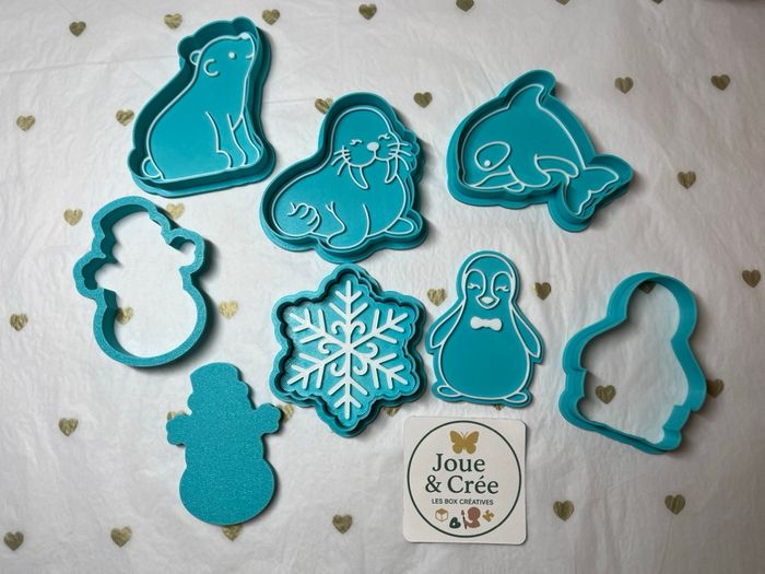 Le kit contient 6 emporte-pièces doubles (découpe + embossage) : - 1 ours polaire - 1 morse - 1 baleine - 1 pingouin - 1 bonhomme de neige - 1 flocon Motifs hivernaux idéals pour créer un bac sensoriel “Monde Polaire”, des ateliers créatifs ou des jeux d’imagination. Ces emporte-pièces 3D permettent la découpe et l’embossage en un seul geste, pour obtenir des formes nettes avec des détails visibles. Dimensions : - Taille approximative : 6 à 9 cm selon le motif - Épaisseur adaptée à une bonne prise en main Matériaux et entretien : PLA, un matériau biosourcé (à base d’amidon de maïs), non toxique. Lavage uniquement à la main, à l’eau tiède + liquide vaisselle doux. Lave-vaisselle et forte chaleur interdits : le PLA peut se déformer au-delà de 55°C. Bien sécher avant rangement.
