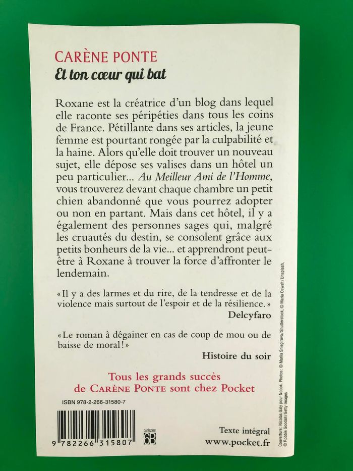 Réduction dès 2 articles achetés 5%, 3 articles 10%, 5 articles et plus 20% Me demander SVP pour que j'applique la réduction avec les frais de port au plus bas. Et si vous faisiez confiance à la vie ? Découvrez un roman drôle et émouvant de Carène Ponte. Roxane est la créatrice d'un blog dans lequel elle raconte ses péripéties dans tous les coins de France. Pétillante dans ses articles, la jeune femme est pourtant rongée par la culpabilité et la haine. Alors qu'elle doit trouver un nouveau sujet, elle dépose ses valises dans un hôtel un peu particulier... Au Meilleur Ami de l'Homme , vous trouverez devant chaque chambre un petit chien abandonné que vous pourrez adopter ou non en partant. Mais dans cet hôtel, il y a également des personnes sages qui, malgré les cruautés du destin, se consolent grâce aux petits bonheurs de la vie... et apprendront peut-être à Roxane à trouver la force d'affronter le lendemain. (1)