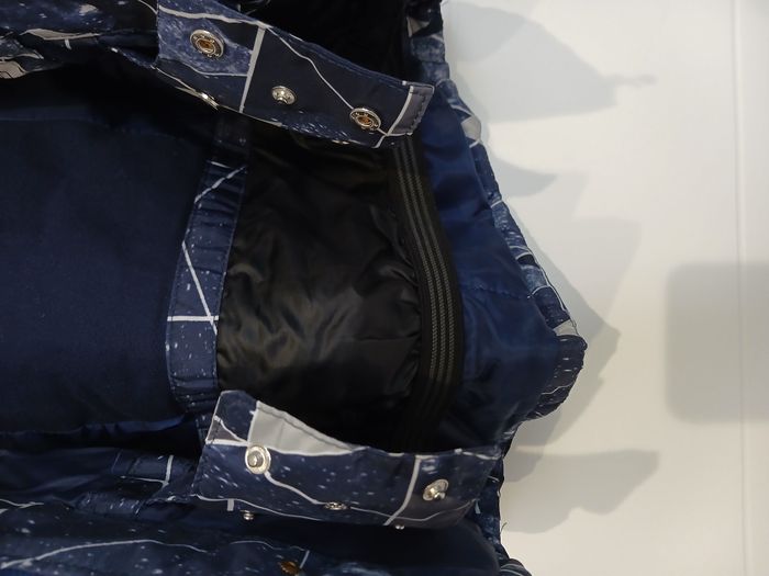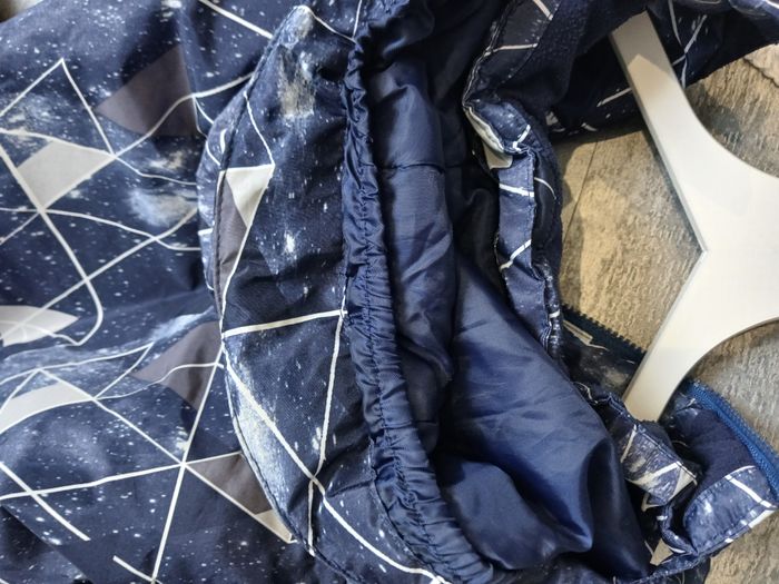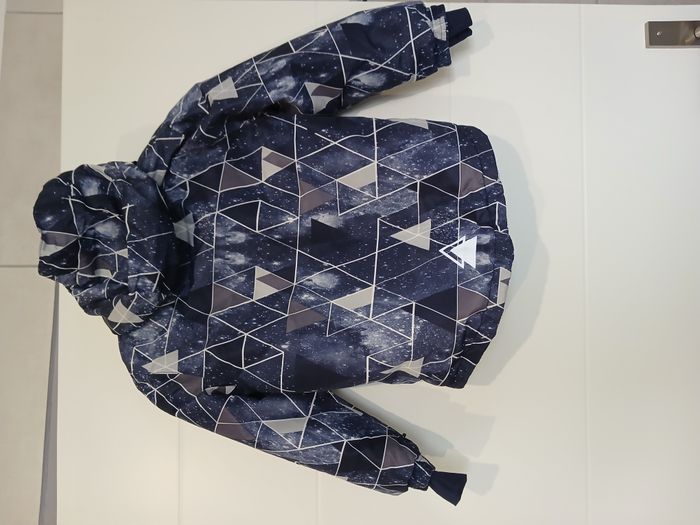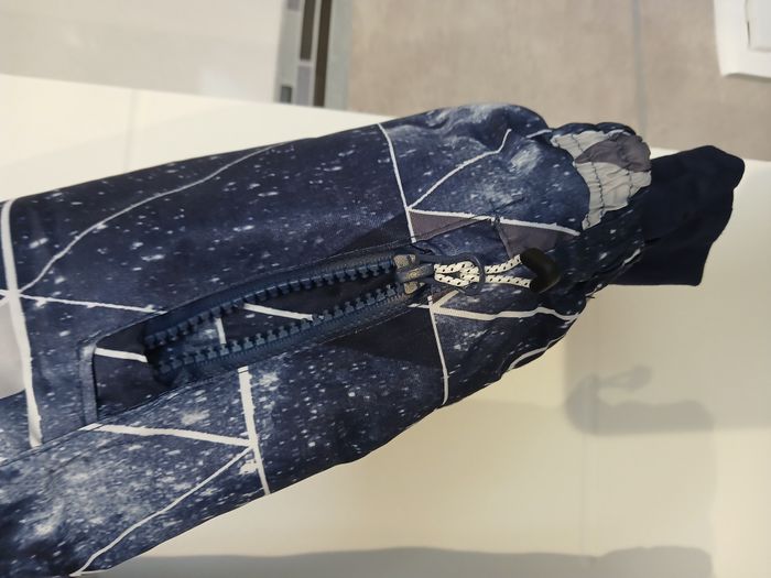 Taille 122 128 (7/8 ans) Blouson de ski en parfait état. Imperméable, chaud, avec capuche amovible par pressions (voir photo). Capuche avec élastique autour. Manches avec passage des pouces. Poche zippée sur la manche gauche pour forfait. (voir photo). 2 poches zippées sue le devant (voir photo). Possibilité de zipper un pantalon (voir photo).
