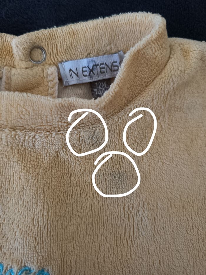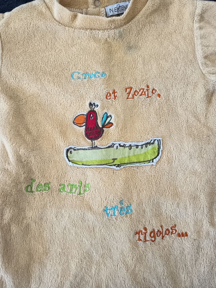 - Taille : 12 Mois (74 Cm) - Tissu extensible/élastique 👉 4ème 📸 : Inscription "Croco et Zozio, des amis très rigolos..." - 7 Boutons presses ❗La couleur jaune ressort mal, il n'est pas aussi clair en (👉 Voir 📸 N°2 qui se rapproche le + de la couleur réelle)❗ 🧶: 80% Coton, 20% Polyester - Fabriqué en Chine 🇨🇳 🔸 Défauts🔸 👉 2 Dernières 📸 : Tâches grisâtre près du col + à la jambe droite