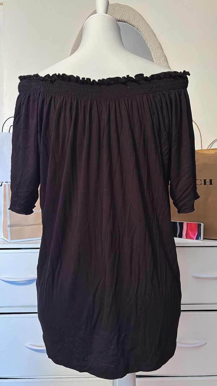 3€ 🪩 Top noir large 💙 Epaules dénudées 📏 Dimensions : longueur 65cm, largeur 62cm 📦 État : Très bon état général Matière : 95% viscose, 5% élasthanne Top noir à encolure bardot (épaules dénudées) avec élastique froncé. Coupe ample et fluide.