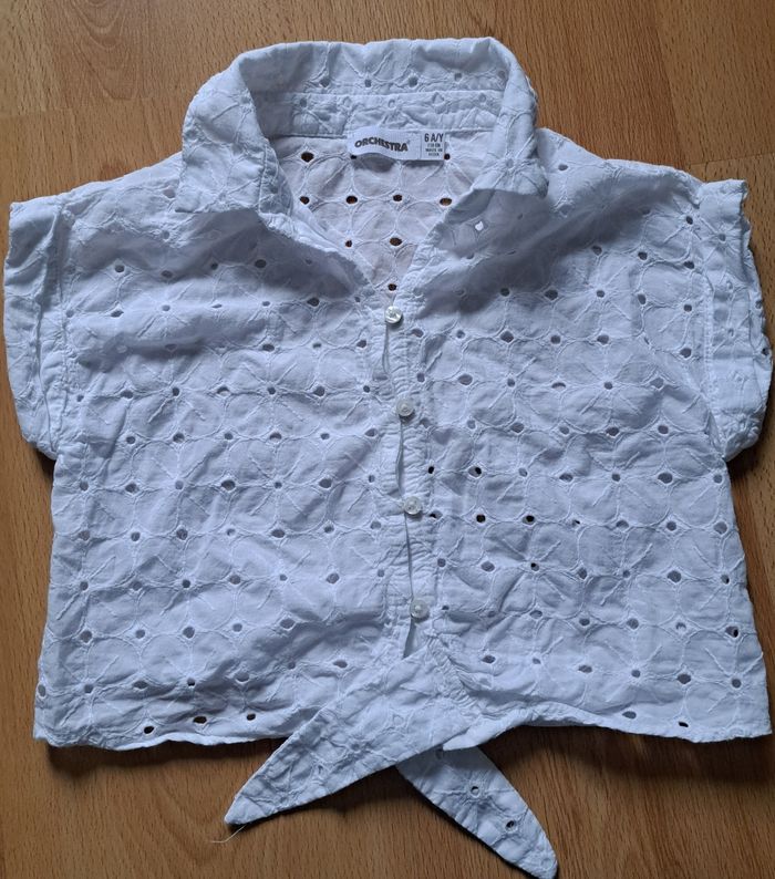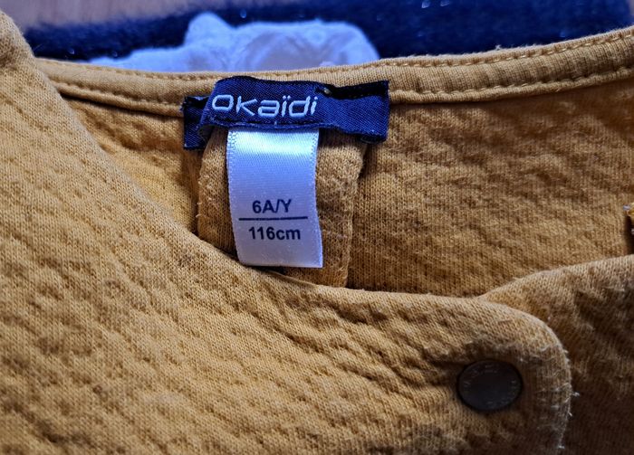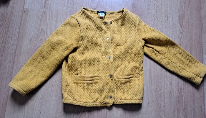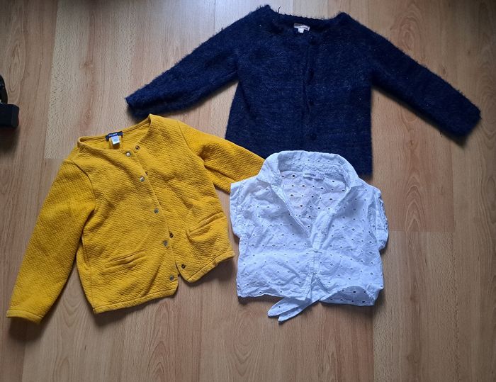 Lot composé de deux gilets et d'un chemisier en taille six ans: -un gilet bleu un peu pailleté marque du pareil au même . Fermeture par bouton à boutonner - un gilet jaune de marque okaïdi. Fermeture par bouton pressio. - un chemisier de marque orchestra. Fermeture par bouton. A boutonner avec des petits élastiques et noeud au niveau de la taille. Tous sont en bon état pas d'accro ou de tâches
