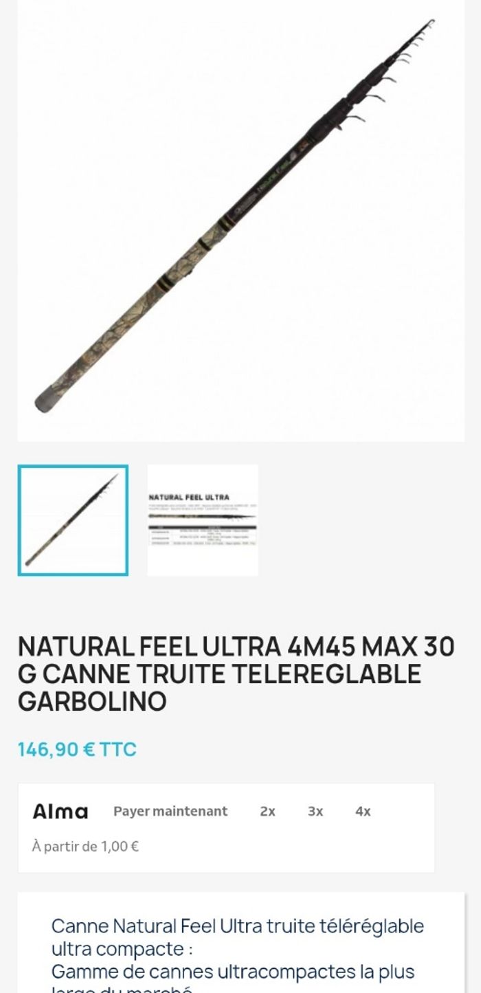 Annonce en ligne = Disponible Canne Natural Feel Ultra truite téléréglable ultra compacte : Gamme de cannes ultracompactes la plus large du marché. Fiche technique: Univers Canne : Truite Type canne : Téléréglable Longueur Cm : 190 à 445 Puissance : 30 g max Poids 310 G Encombre/Cm : 79 Neuf jamais servis en parfait état. Envoi possible