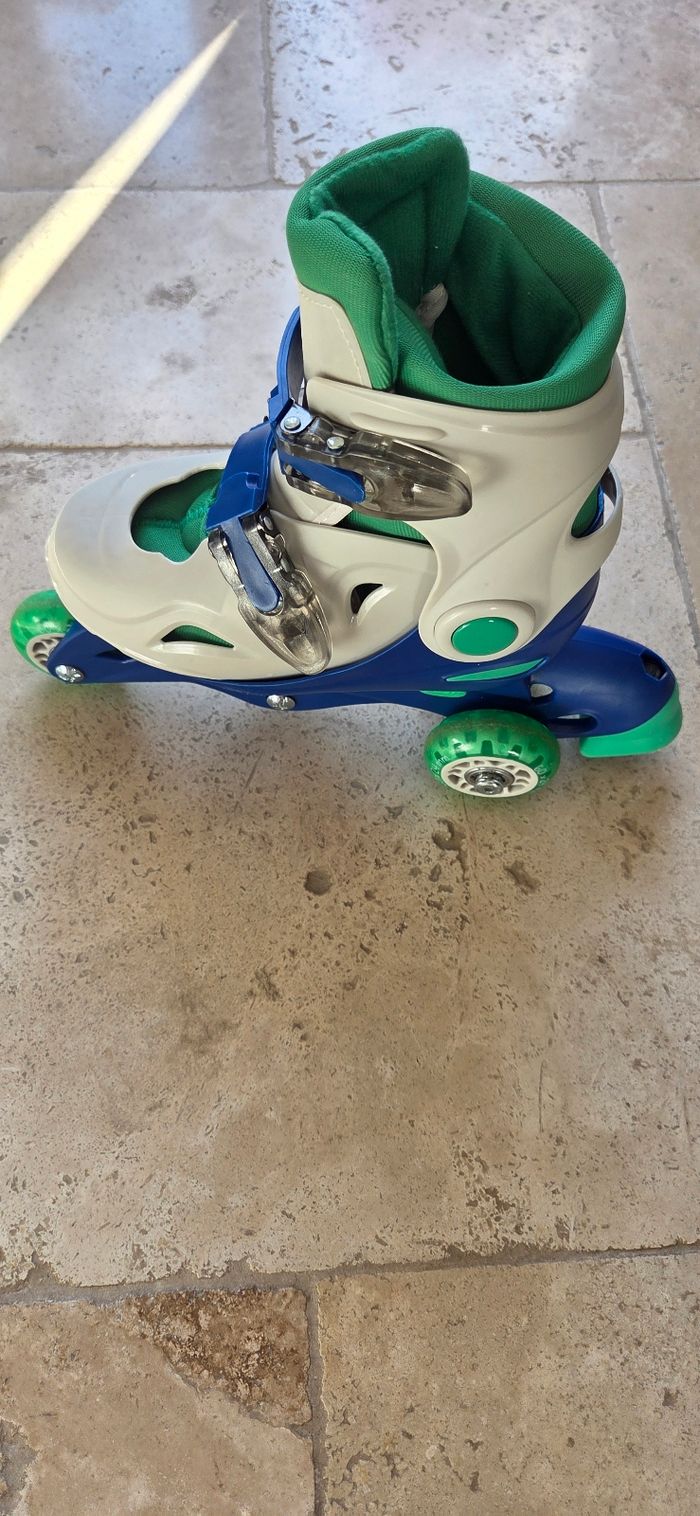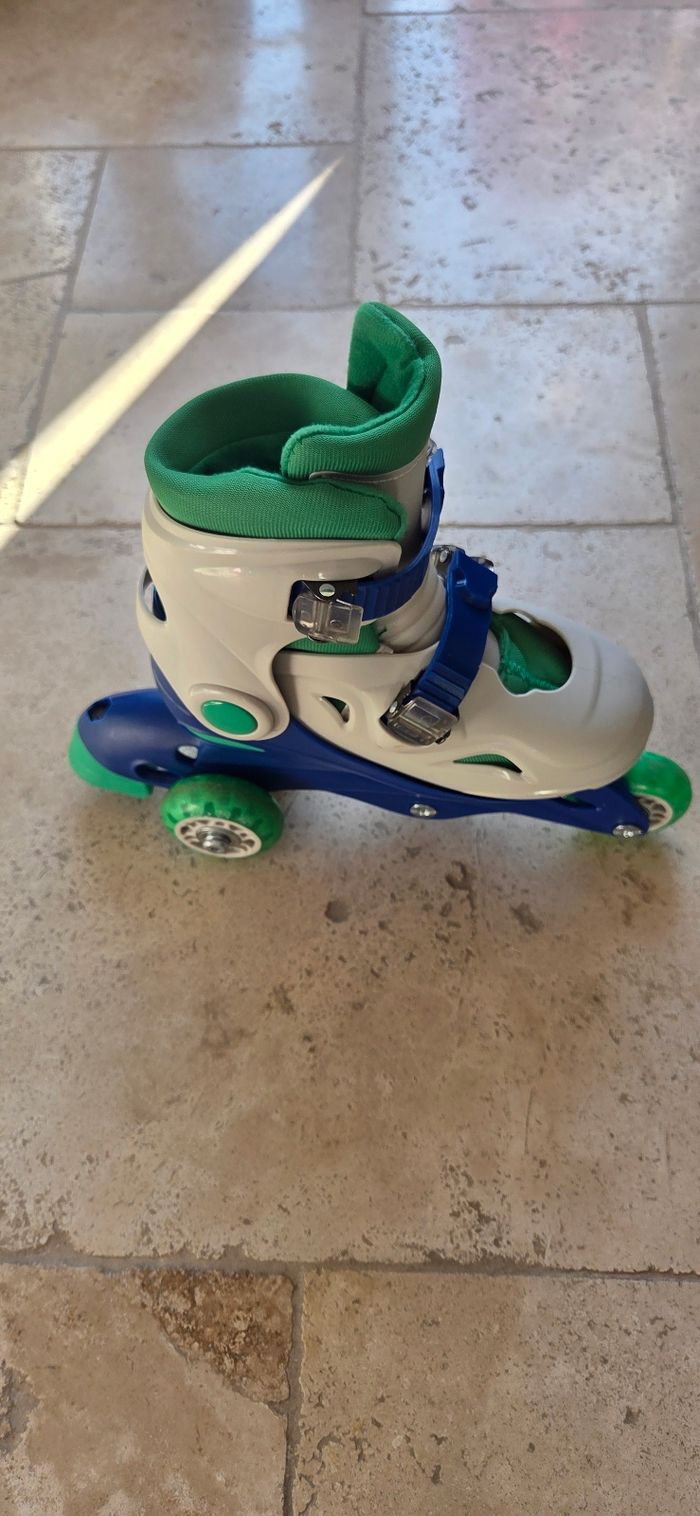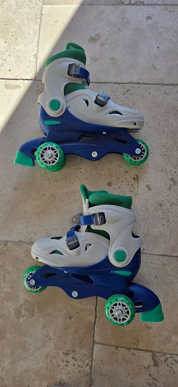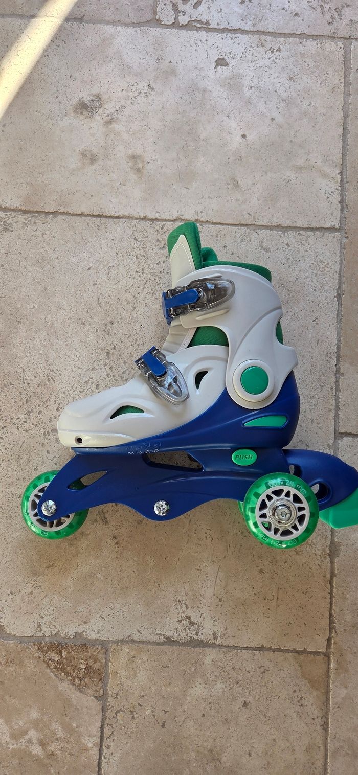 Vends rollers évolutifs Oxybul réglables du 30 au 33. 2 configurations possibles : • 3 roues en ligne pour patiner comme les grands • 1 roue avant + 2 roues arrière pour plus de stabilité et un apprentissage en douceur