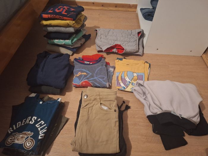 Bon etat general présente des petits defaut ( possible d envoyer en photos) ne gêne en rien pour etre porter 2 polaires 1 pyjama fin spiderman 3 pantalons 3pulls fins 1 doudoune sans manche 2 t-shirt 1 gilet polaire 8pulls epais