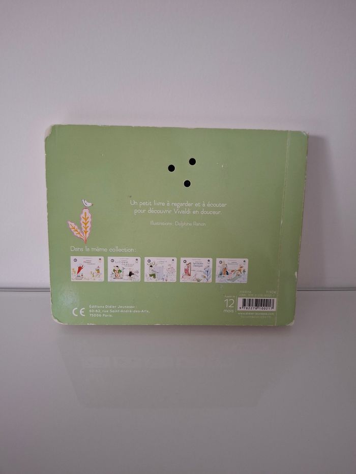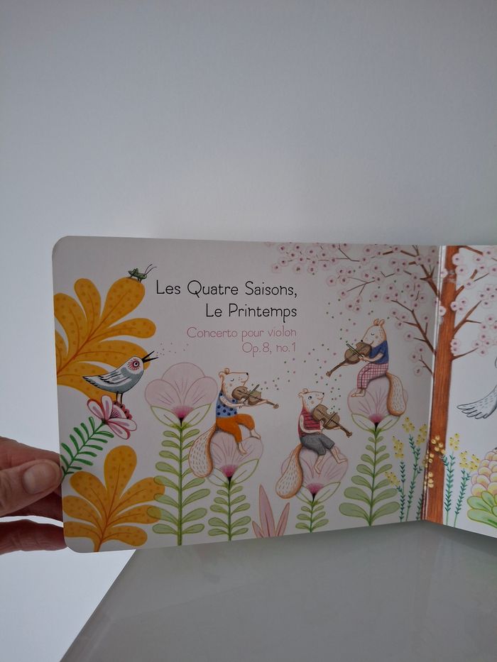 Très belles illustrations. Sur les 5 pages musicales, 1 ne fonctionne pas (Les 4 saisons hiver). Pour les autres, c'est testé, cela fonctionne très bien. Vendu avec les piles (qui sont neuves). Pages intérieures en très bon état, couverture en bon état.