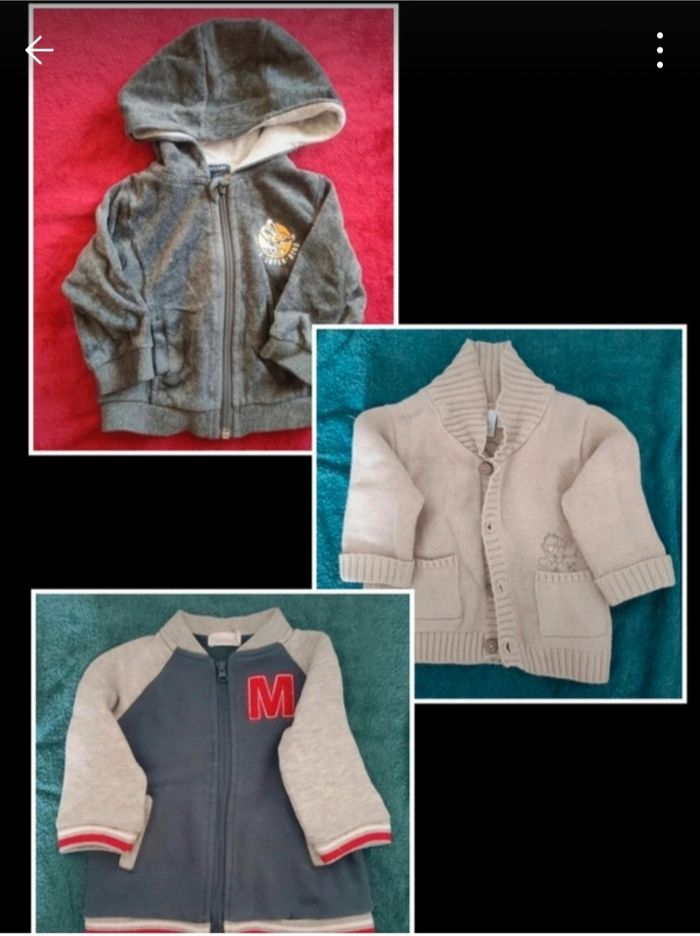2 sweats zippés dont 1 à capuche 1 gilet boutonné