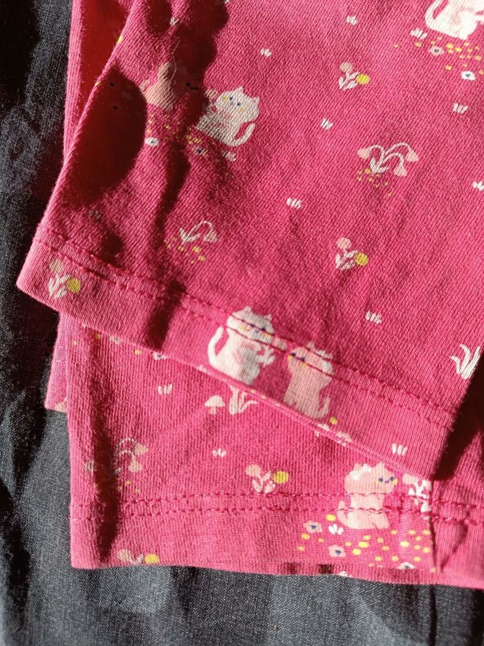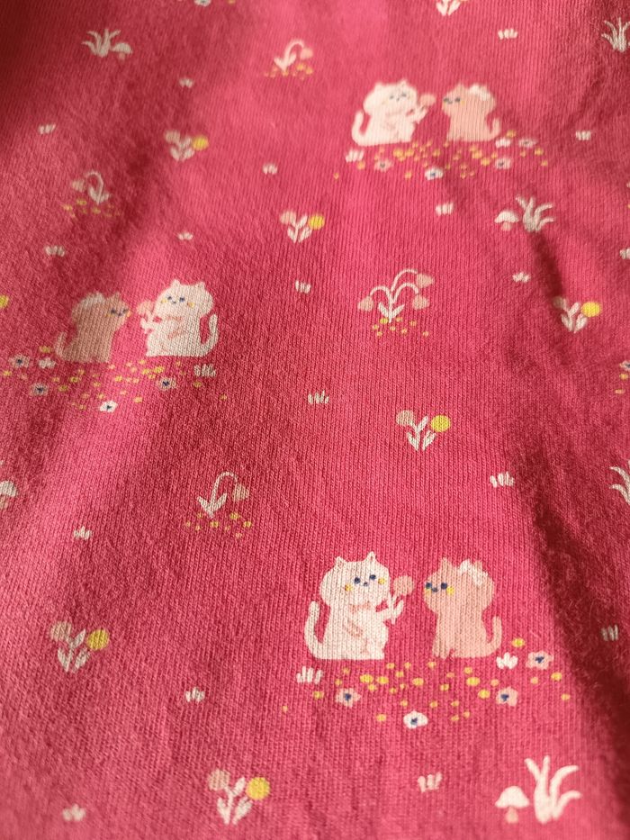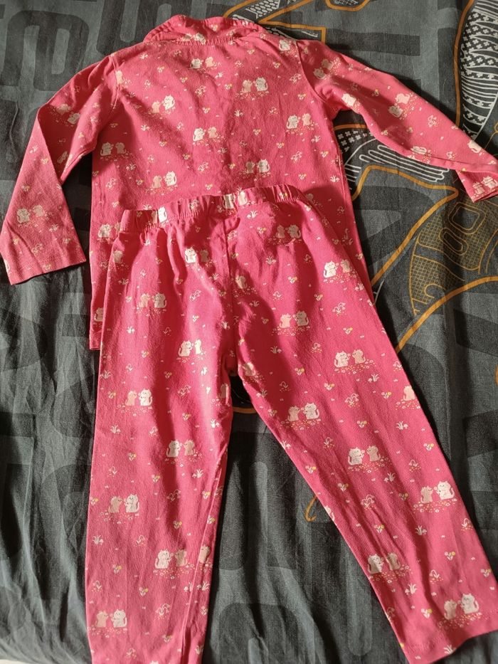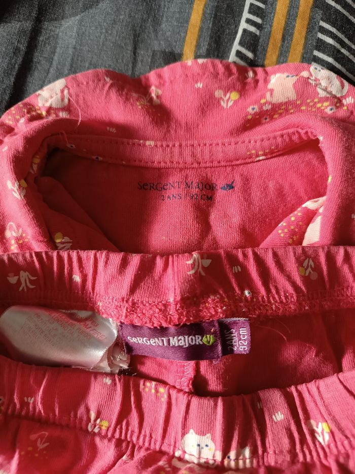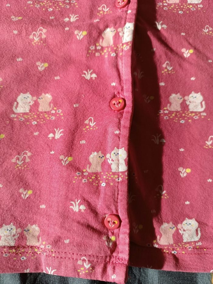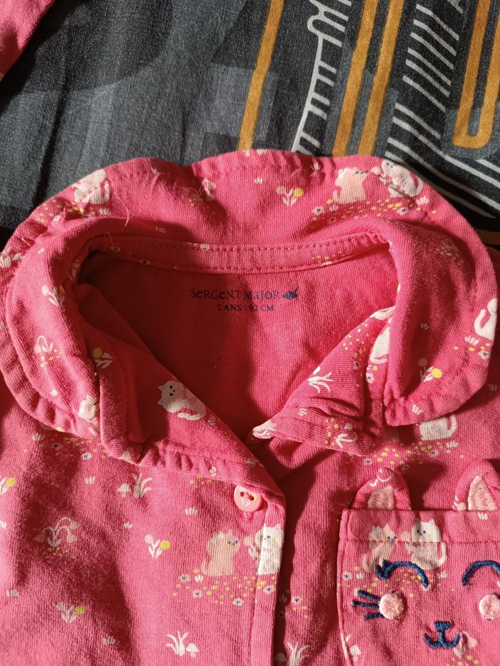 Pyjama 2 pièces imprimé chatons sur fond rose. Broderie sur poche taille 2 ans. Bon état général, élastique pantalon et surpiqûres ok