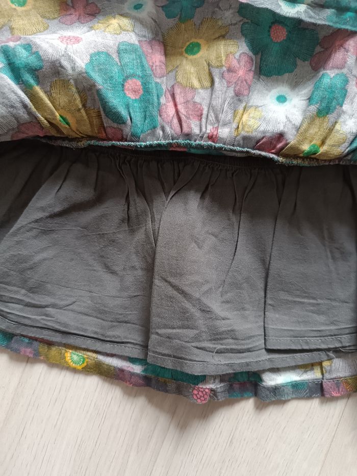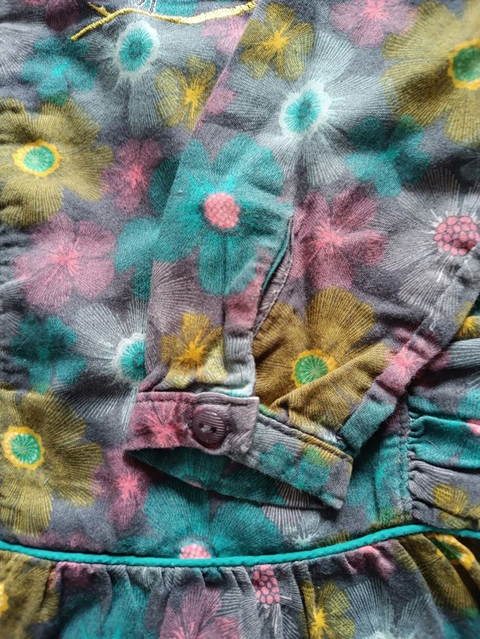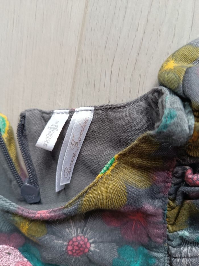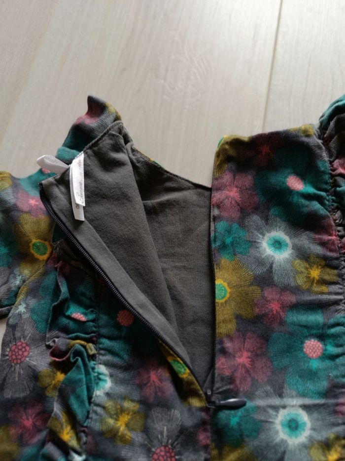 Robe en coton toute doublée, idéale pour le printemps et l'automne. Fermeture dos par zipp. Broderie oiseau sur le devant, imprimée turquoise/jaune/rose sur fond gris. Très peu porté taille 2 ans
