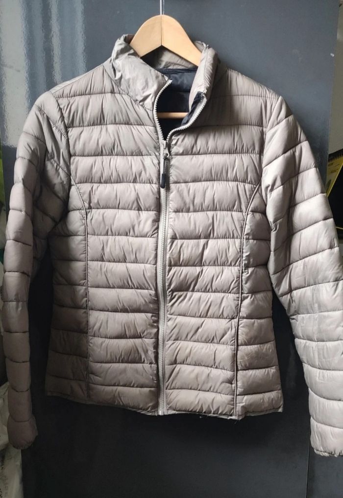 Doudoune courte qui taille correctement Couleur taupe Poches extérieures et intérieures Pas de capuche Très bon état général