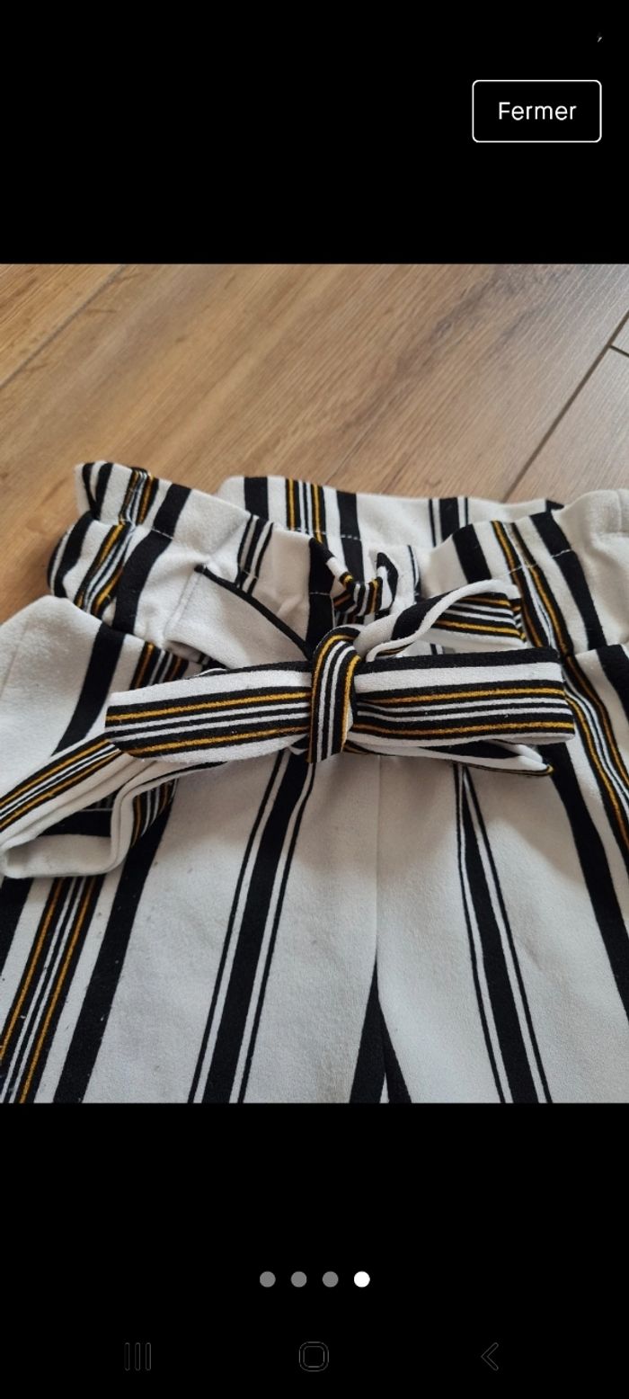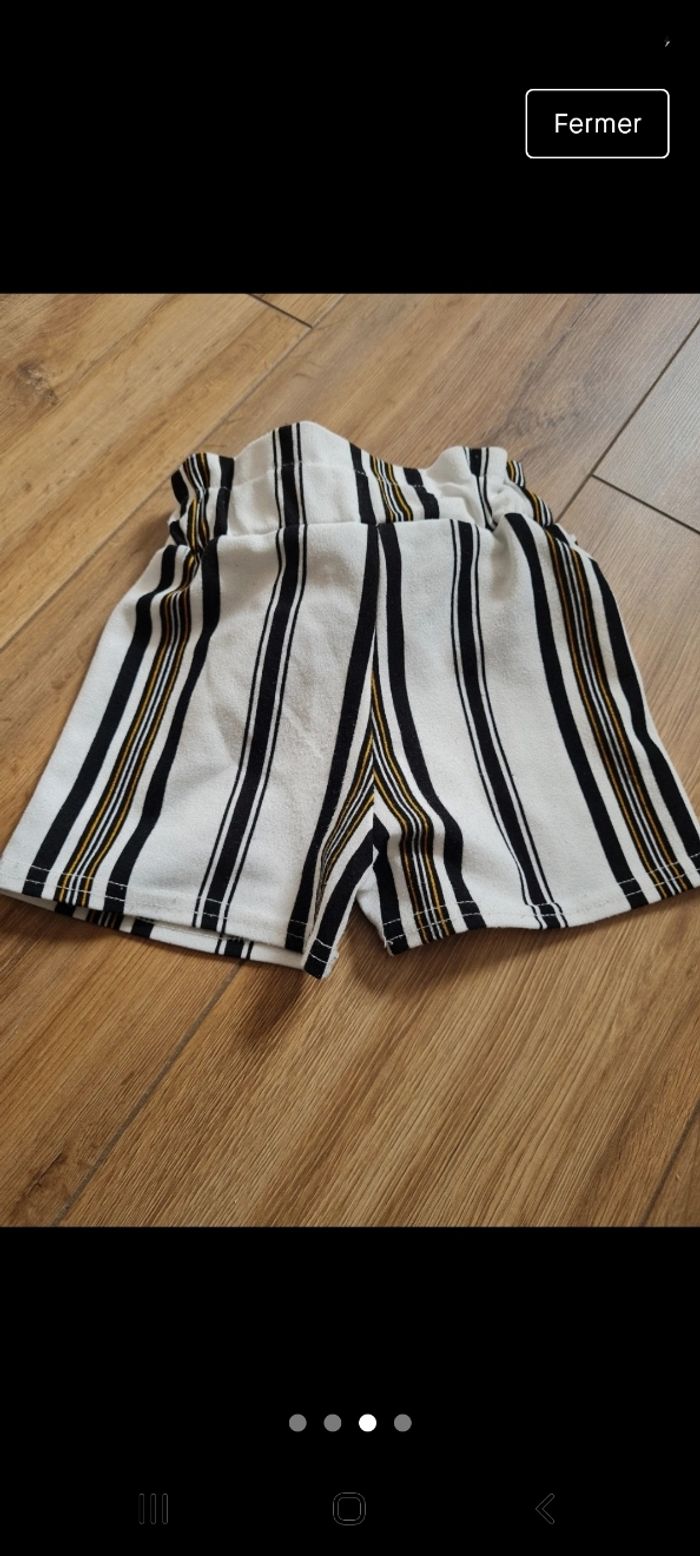 Short fluide, taille élastiquée, effet ceinture. Blanc cassé, rayé noir et moutarde. 3 ans, qlq petites bouloches (voire photos)