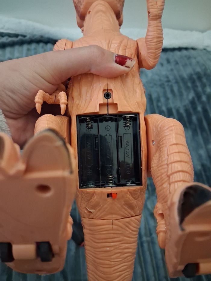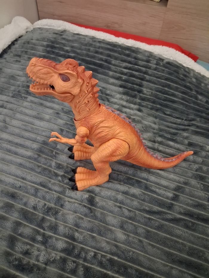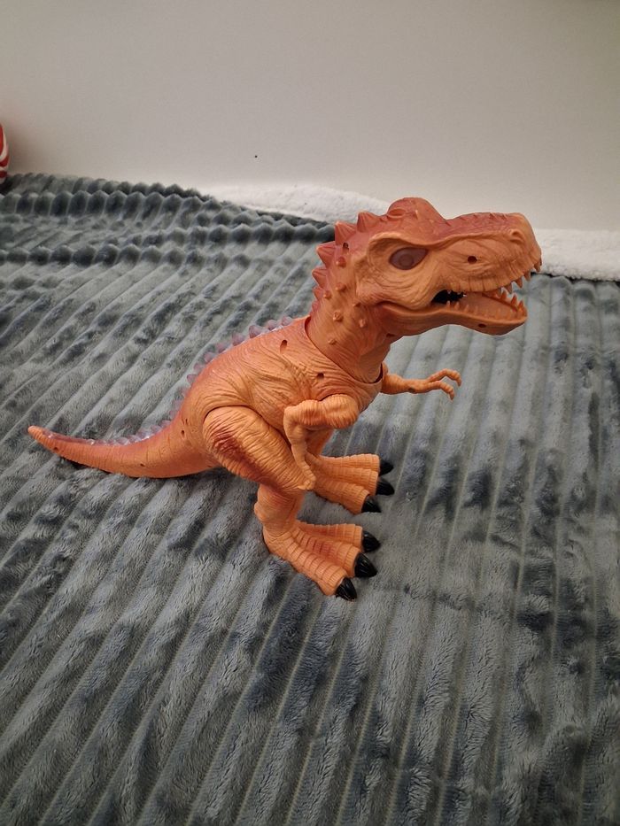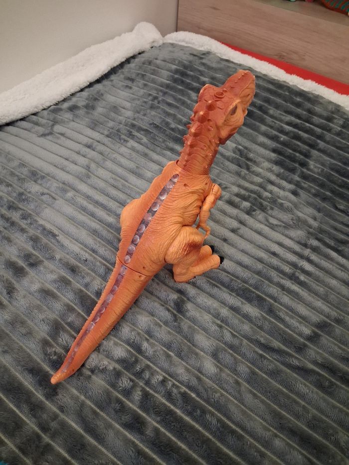 Grand dinosaure lumineux et sonore, fonctionne avec 3 pilles AA (non incluses) Couleur orangé, en excellent état N'hésitez pas à me contacter si vous avez des questions 😀
