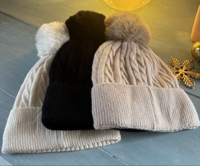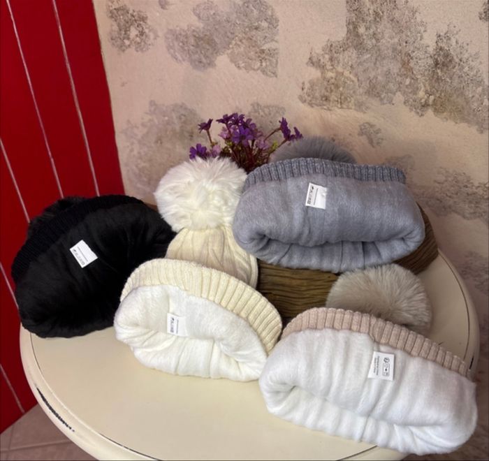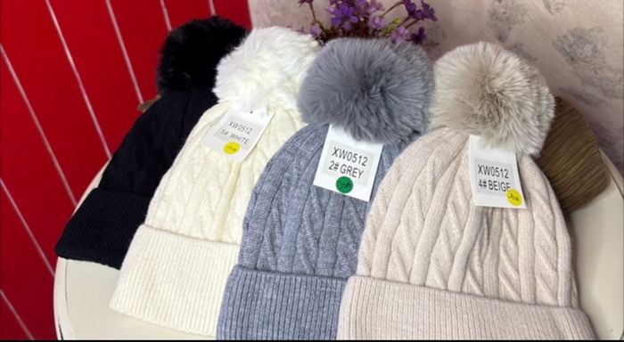Bonnet 100 % acrylique Quatre. Couleurs disponibles Noir, gris, beige et blanc Chaud et doux 8€ le bonnet