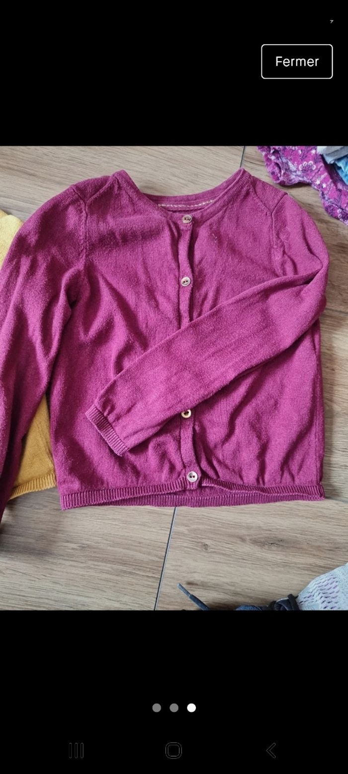 Un gilet moutarde et un gilet bordeaux. Un peu "rêche" mais bon état. 3 ans Kiabi