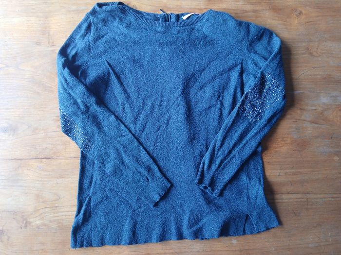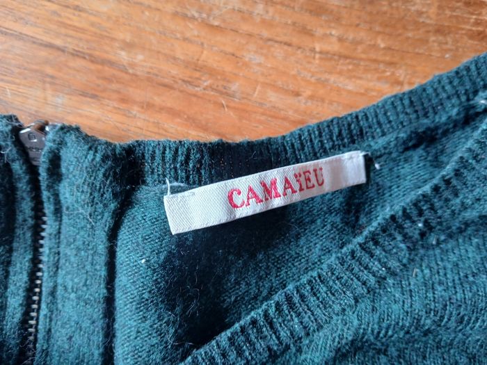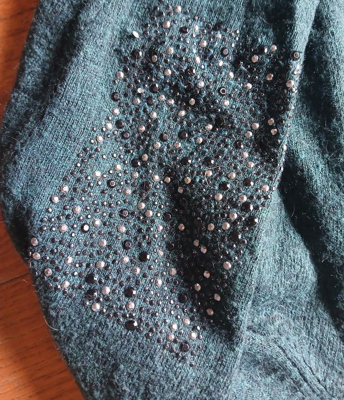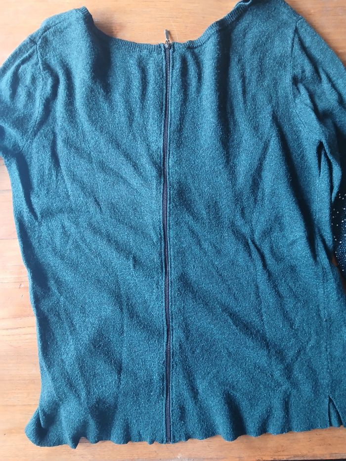Pull vert foncé, petites perles aux coudes. Grande fermeture eclair sur toute la hauteur du dos. Etiquette coupées, mais correspond a une taille M Tres bon état