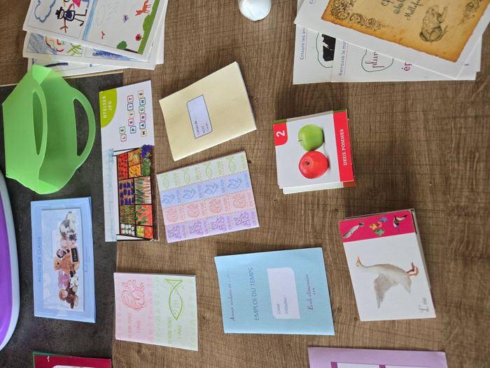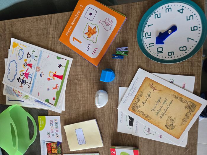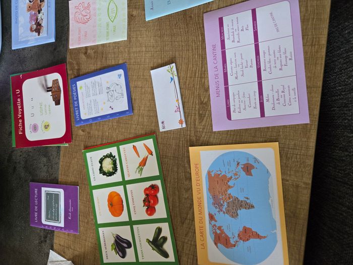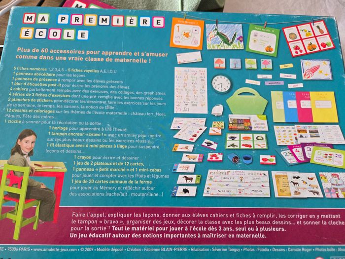 jeu d'imitation "ma 1ère école" comprend des fiches Nombres, des cahiers, des fiches d'excercice, 1 cloche, 1 tampon encreur, 1 horloge, des cartes animaux... marque Amulette le jeu n'est pas au complet, mais il permet de jouer convenablement