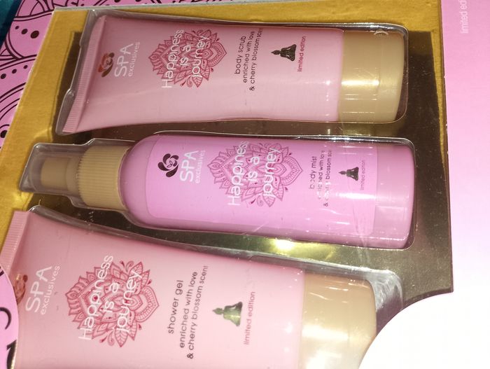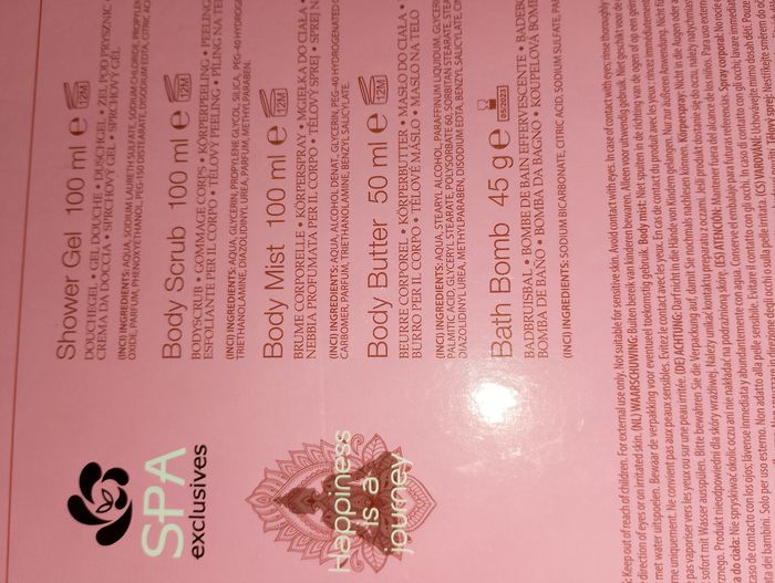 Coffret spa exclusives happiness is a journey neuf Gel douche 100ml Gommage corps 100ml Brume corporelle 100ml Beurre corporel 50ml Bombe de bain effervescente 45g Idéal cadeau anniversaire, noël, Sainte-Catherine, Pâques, saint Valentin