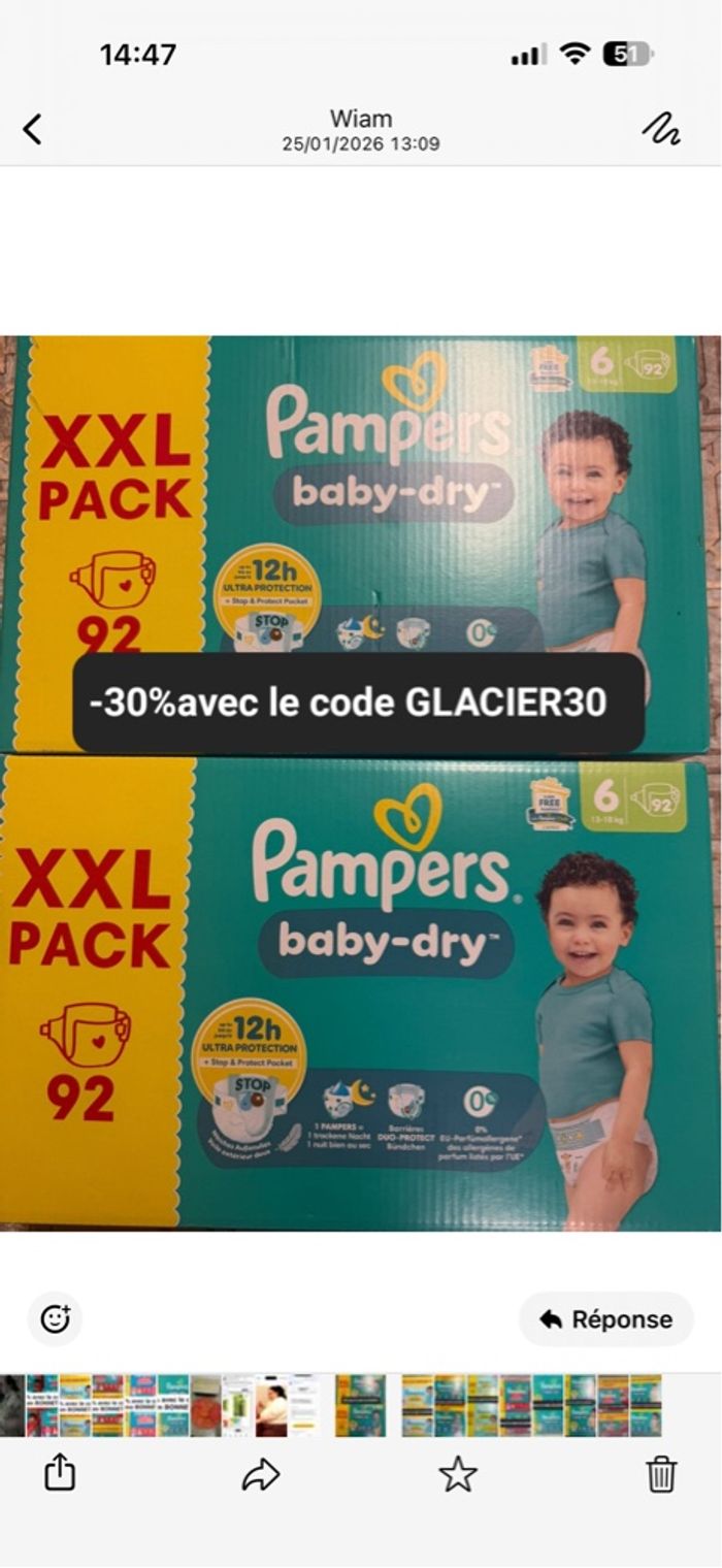 2 cartons de couches Pampers taille six