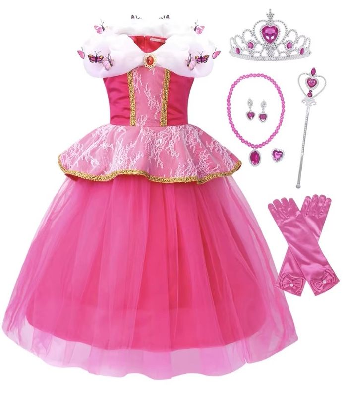 Déguisement robe de princesse rose petit papillon et ces accessoires (papillons, couronne, baguette, gants, bijoux). 3 tailles disponibles : -5-6ans : longueur de la robe 90cm, -7-8ans : longueur de la robe 100cm, -10-11ans : longueur de la robe 120cm, Vendu dans leur pochette d’emballage d’origine, idéal pour faire un cadeau ! Expédition rapide après votre commande