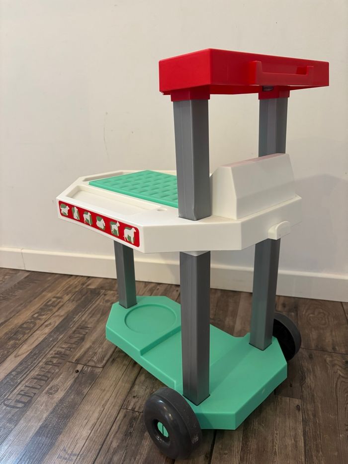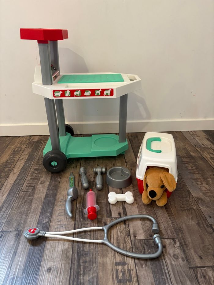 Chariot clinique vétérinaire Ecoiffier Table d'examen roulante pour ce joli chien en peluche avec valisette de transport, écuelle, os et les accessoires du vétérinaire. Il manque quelques pièces. Jouet en très bon état. Se démonte N’hésitez pas si vous avez des questions 😉☺️
