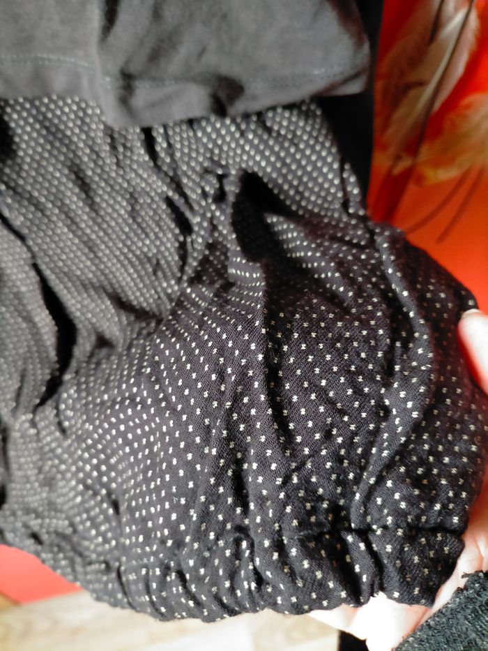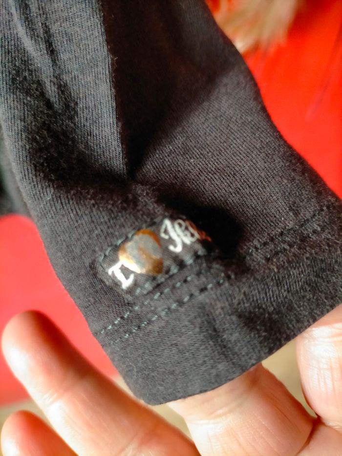 BE Porté mais aucun défaut. Jolie robe à manches longues et effet de superposition. Haut en jersey de coton noir avec nœuds devant et signature Ikks à l'a base d'une manche et base en cotonnade noire à pois blancs