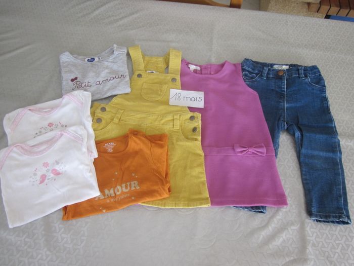 18m, jean + robe sans manche + robe salopette + 2 hauts ml + 2 bodies ml, in extenso, mot d'enfants