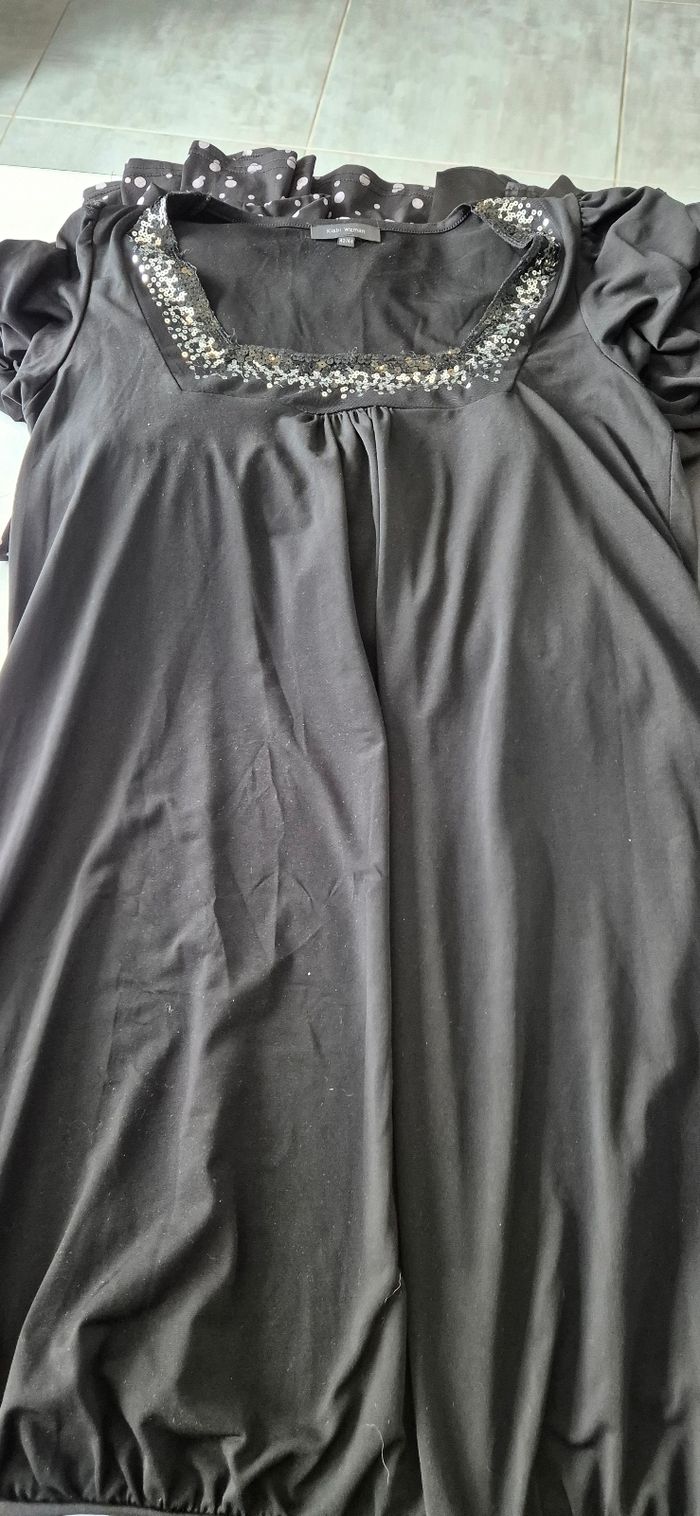 Lot de vêtements femme taille 42/44. ⚠️ la tunique à pois est dans un autre lot je me suis trompée de taille en la mettant dans celui ci Robe manches longues en satin h&m taille M mais taille grand. Robe noir à sequins kiabi taille 42/44 Tee shirt manches longues violet kiabi etiquette coupée