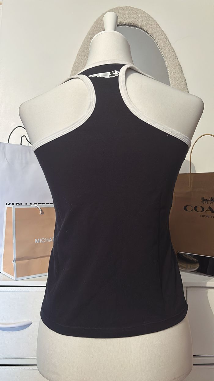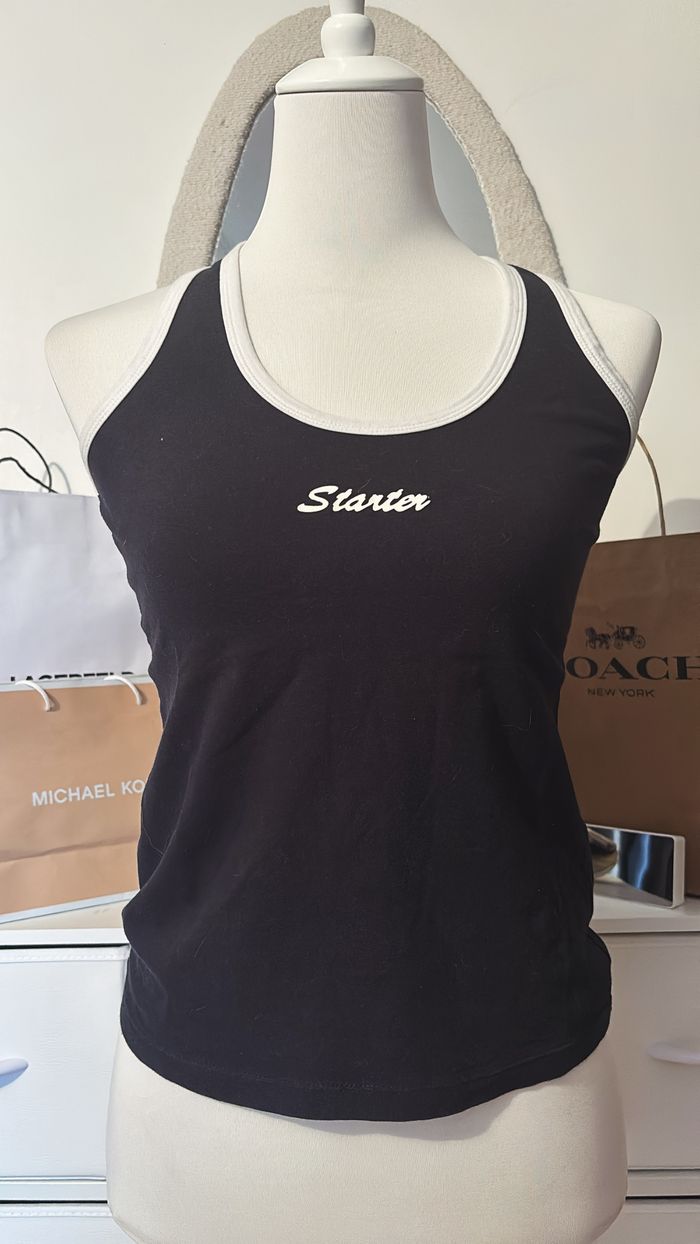 5€ 🪩 Débardeur noir sportwear 📏 Dimensions : longueur 56cm, largeur 39cm 📦 État : Très bon état Matière : 90% coton, 10% élasthanne Débardeur Starter au style sportwear rétro. Coloris noir avec liserés blancs, logo Starter imprimé à l’avant et petit logo ailé à l’arrière. Coupe ajustée avec dos nageur.